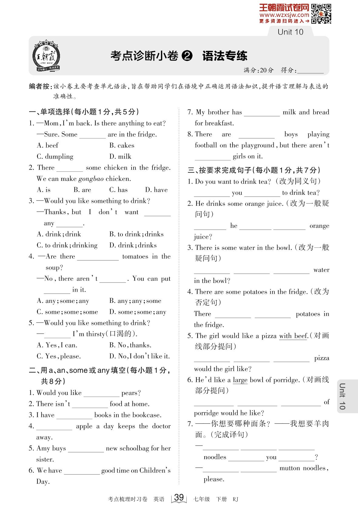 2023下册七年级英语人教版 Unit 10 考点诊断小卷2 语法专练_R230220091935319