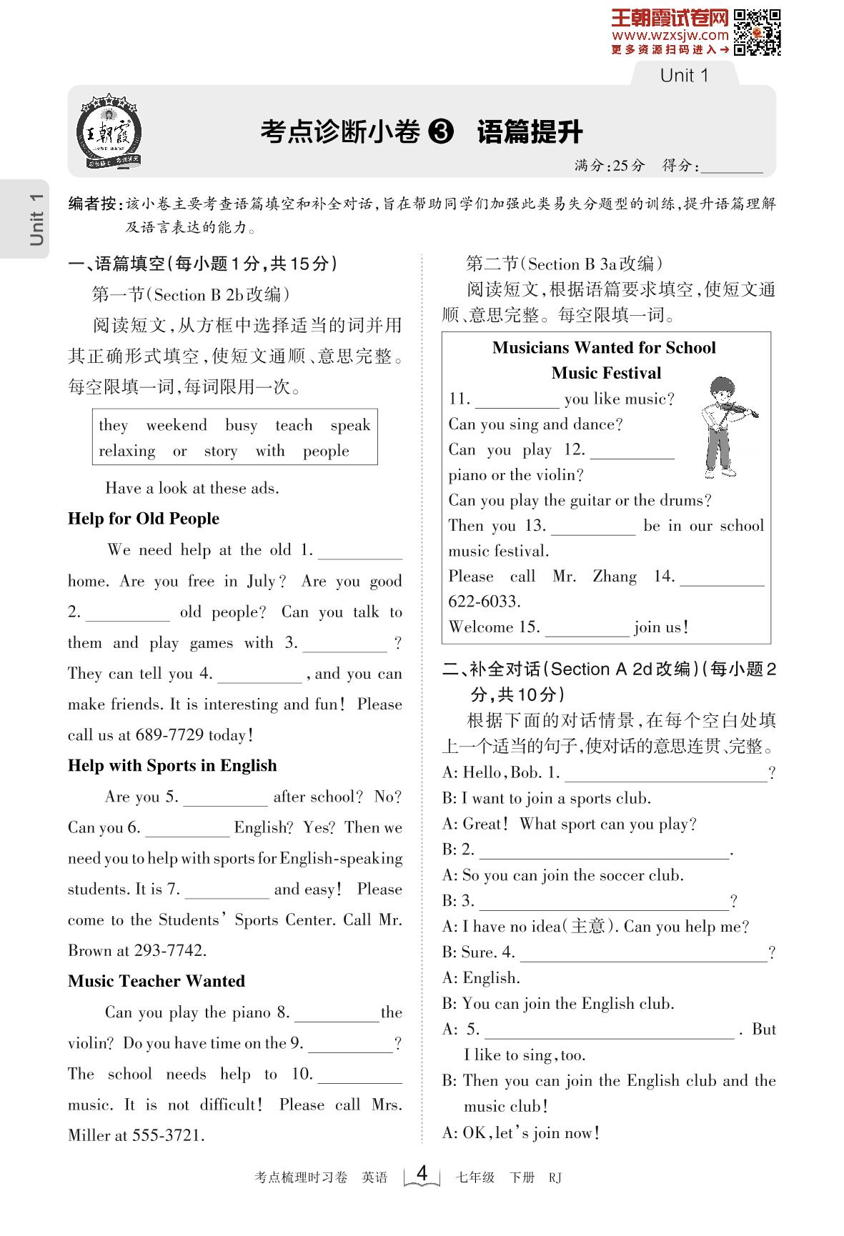 2023下册七年级英语人教版 Unit 1 考点诊断小卷3 语篇提升_R230220091936342
