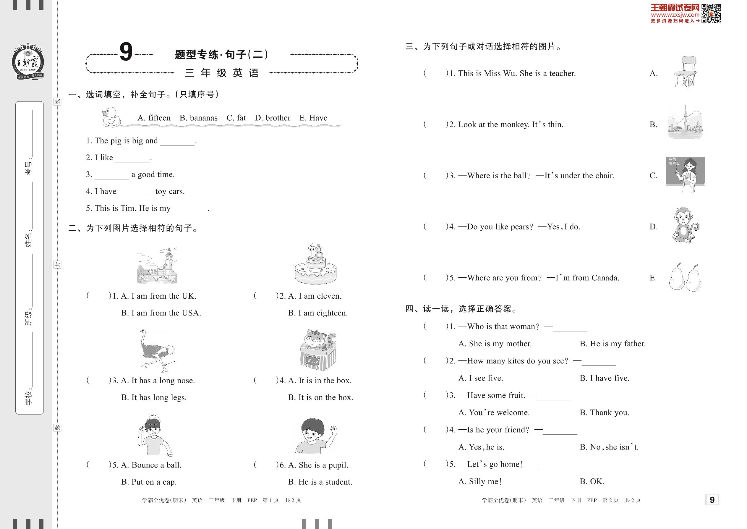 2023下册三年级英语人教PEP版 9 题型专练·句子(二)