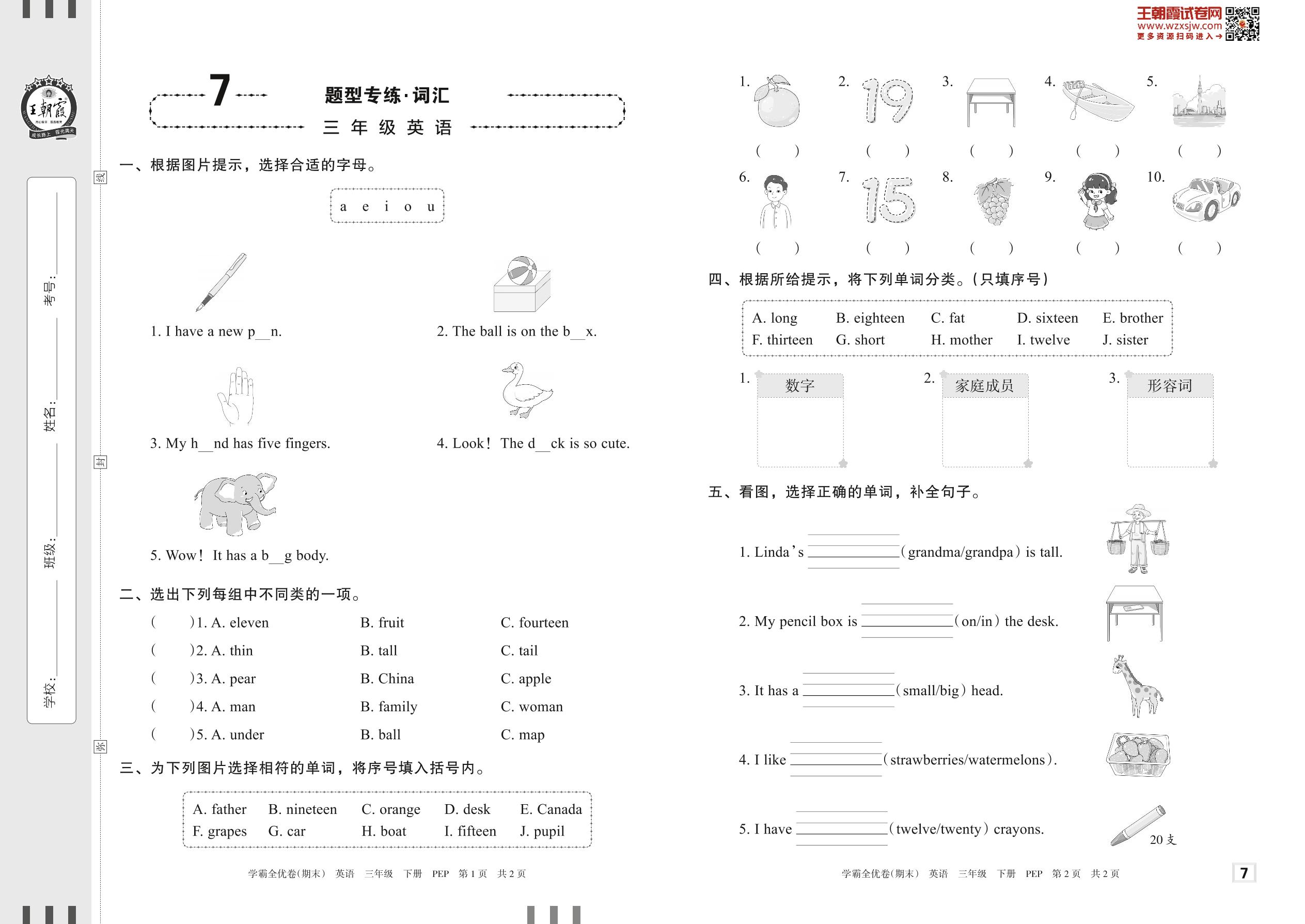 2023下册三年级英语人教PEP版 7 题型专练·词汇