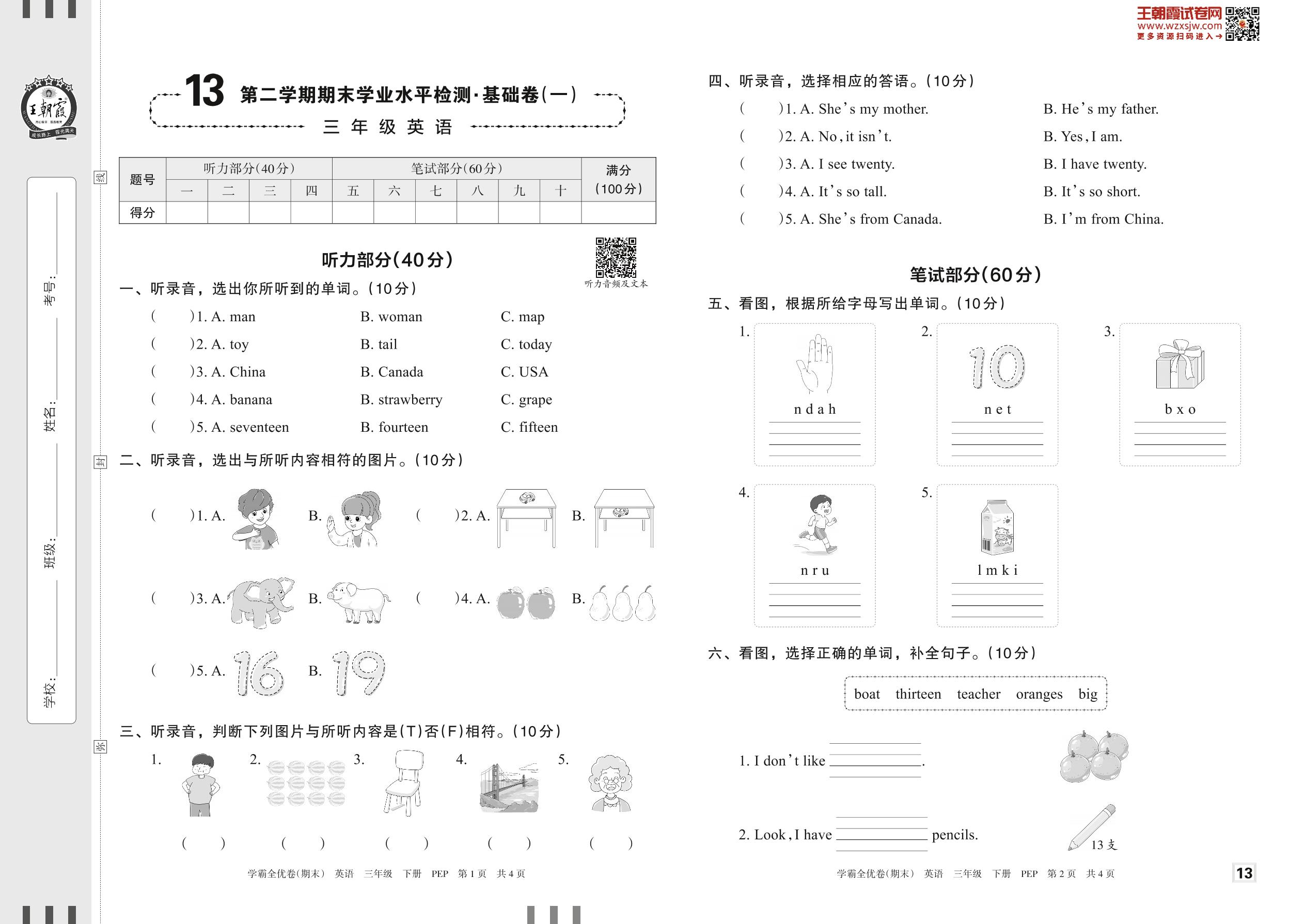 2023下册三年级英语人教PEP版 13 第二学期期末学业水平检测·基础卷(一)
