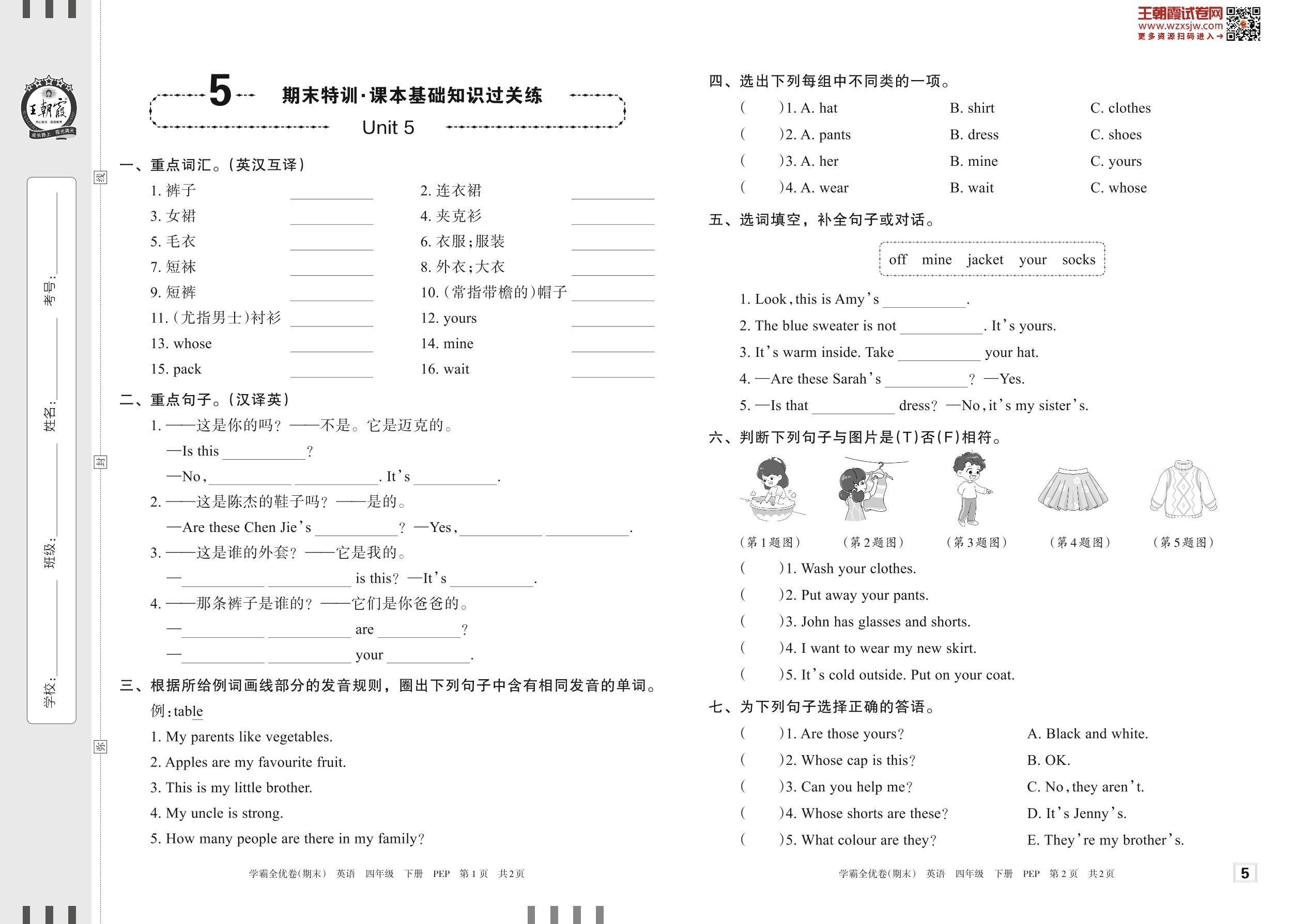 2023下册四年级英语人教PEP版 5 期末特训·课本基础知识过关练——Unit 5