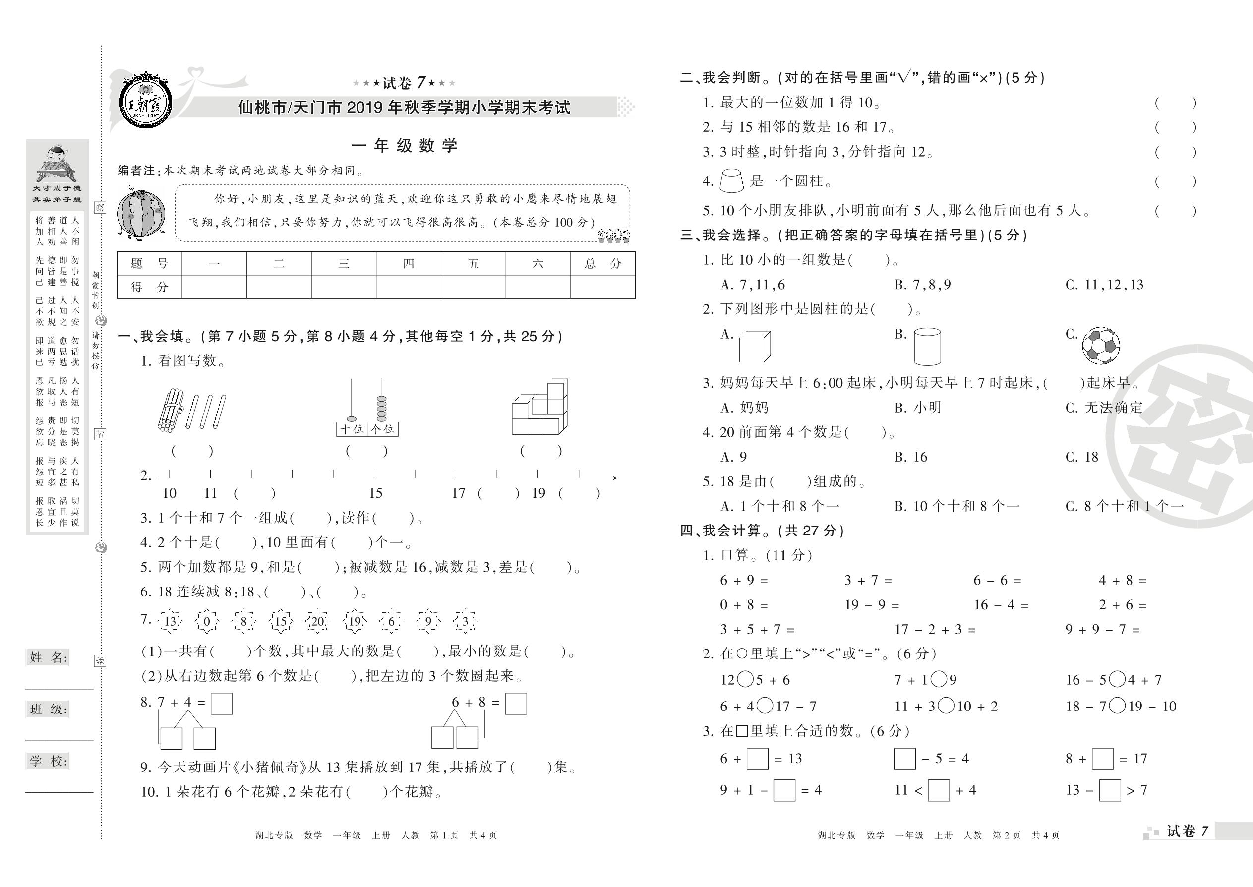 2019-2020学年第一学期仙桃市、天门市一年级数学试卷(人教版)【7】