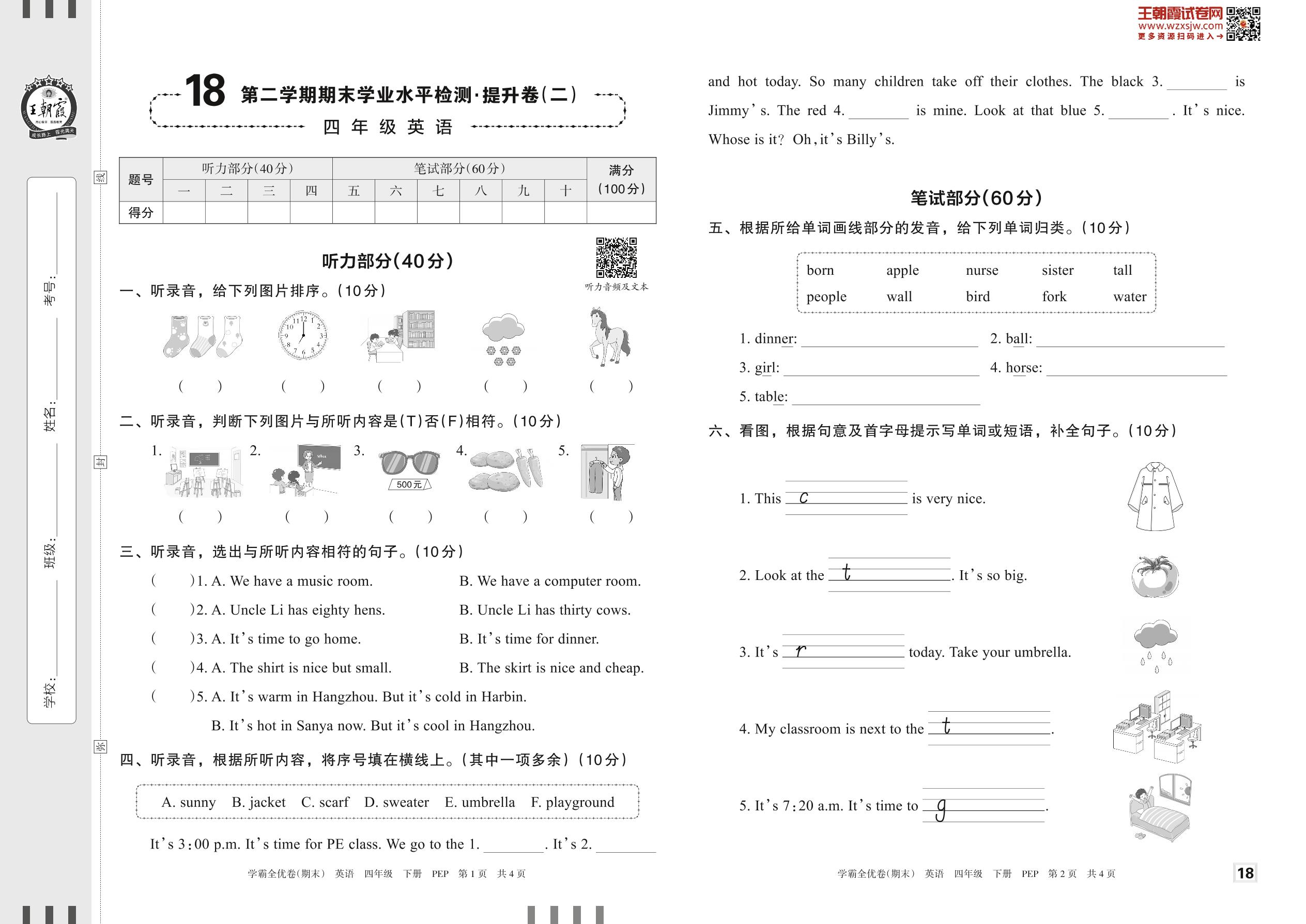 四年级英语人教PEP版(三起始)下册期末卷
