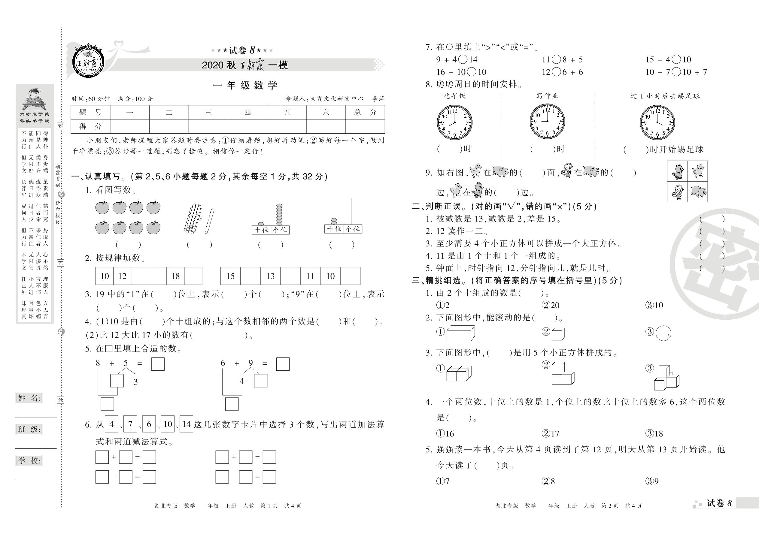 王朝霞期末模拟卷一年级上册数学(人教版)_R210802212428【8】
