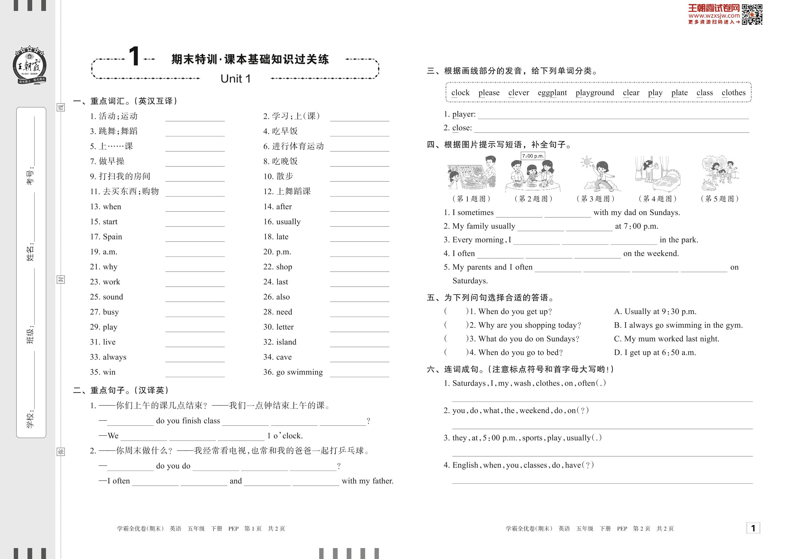 2023下册五年级英语人教PEP版 1 期末特训·课本基础知识过关练——Unit 1