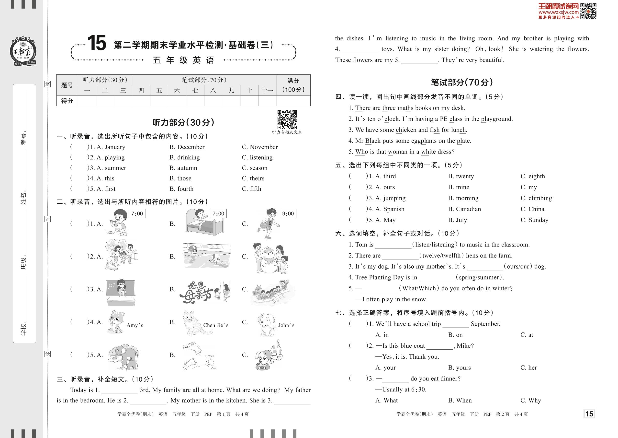 五年级英语人教PEP版(三起始)下册期末卷