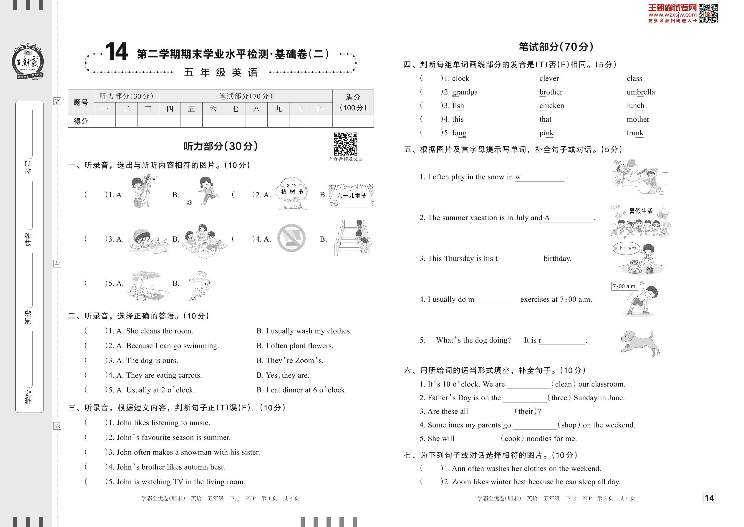 2023下册五年级英语人教PEP版 14 第二学期期末学业水平检测·基础卷(二)