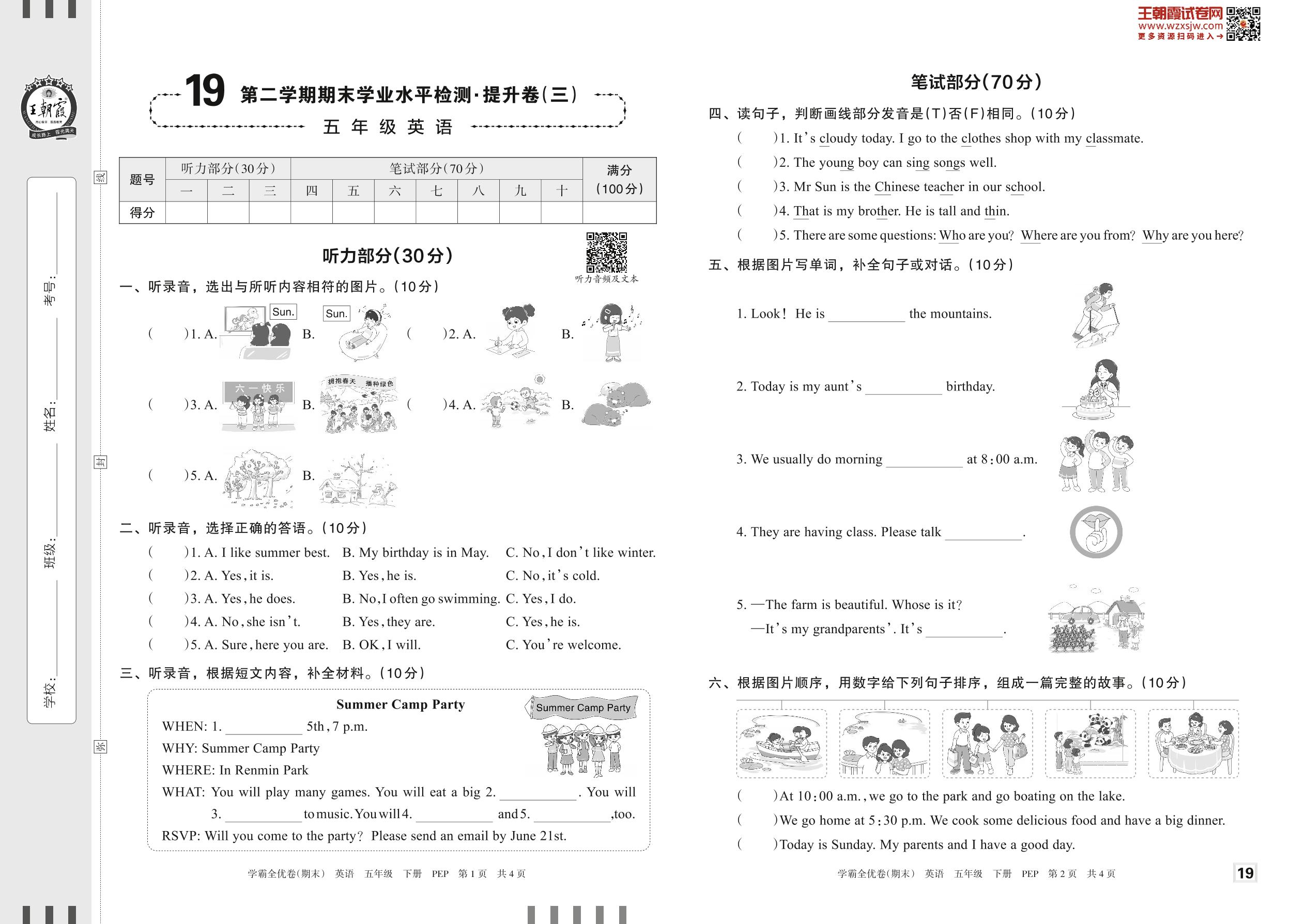 2023下册五年级英语人教PEP版 19 第二学期期末学业水平检测·提升卷(三)
