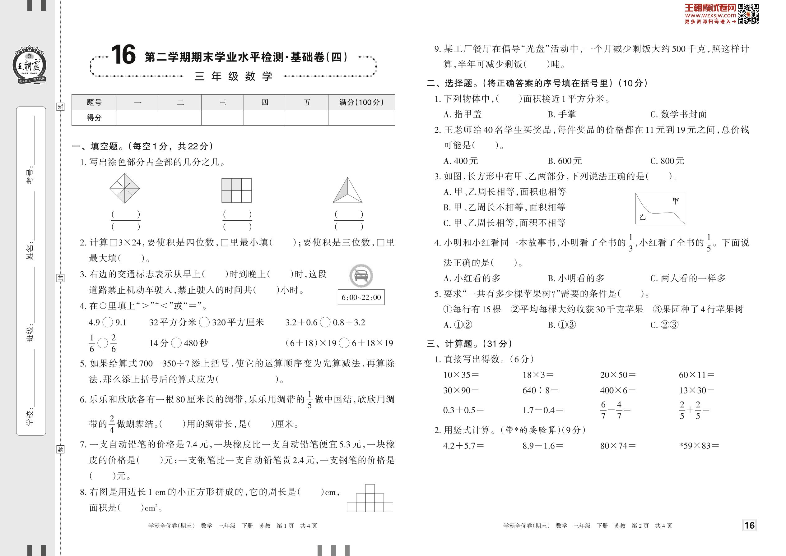2023下册三年级数学苏教版 16 第二学期期末学业水平检测·基础卷(四)