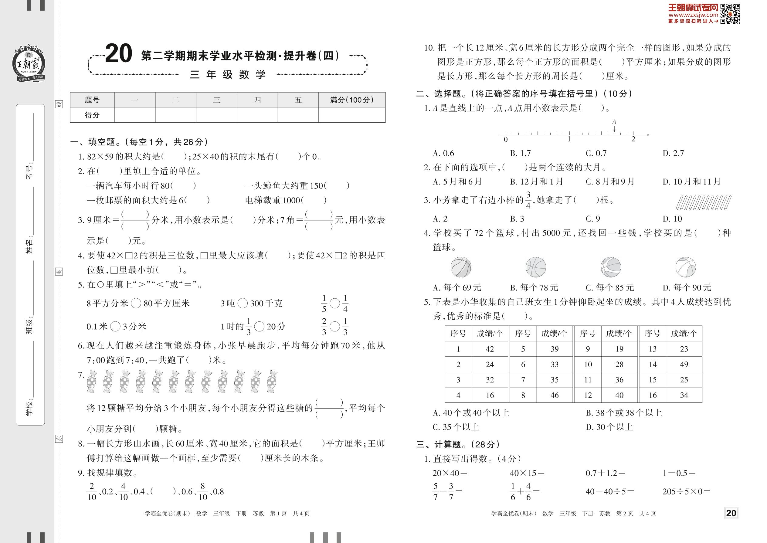 2023下册三年级数学苏教版 20 第二学期期末学业水平检测·提升卷(四)