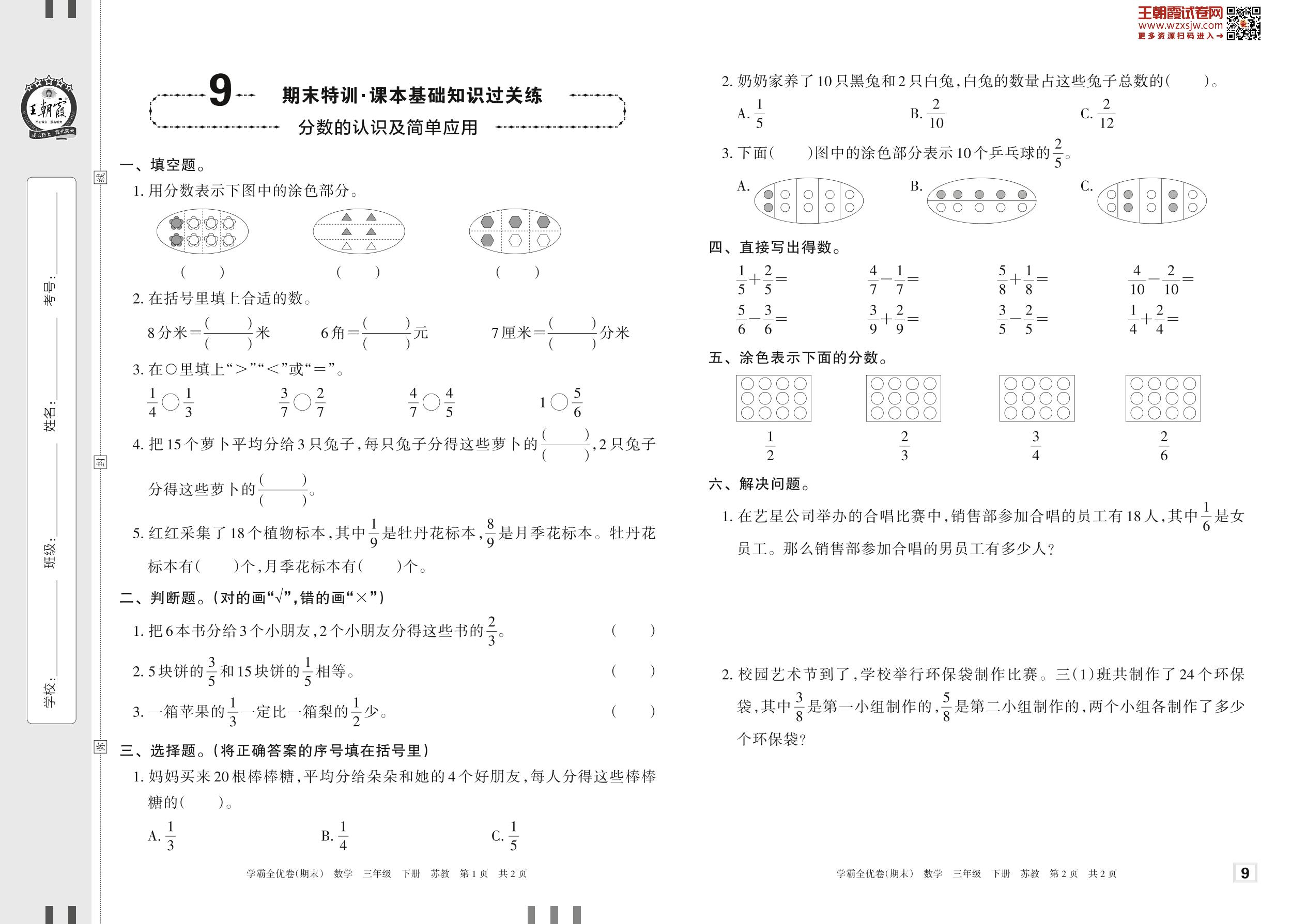 2023下册三年级数学苏教版 9 期末特训·课本基础知识过关练——分数的认识及简单应用