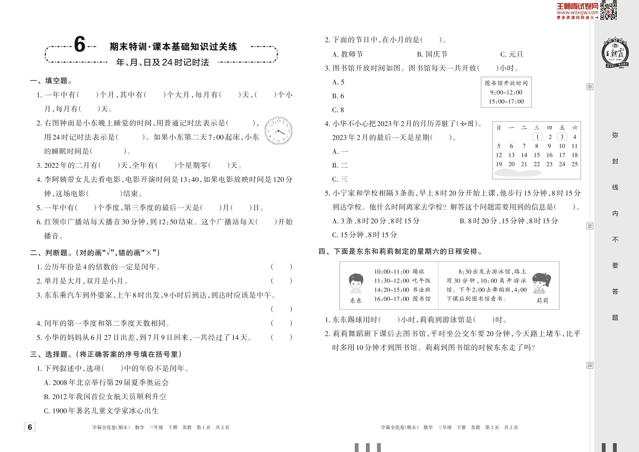 2023下册三年级数学苏教版 6 期末特训·课本基础知识过关练——年、月、日及24时记时法