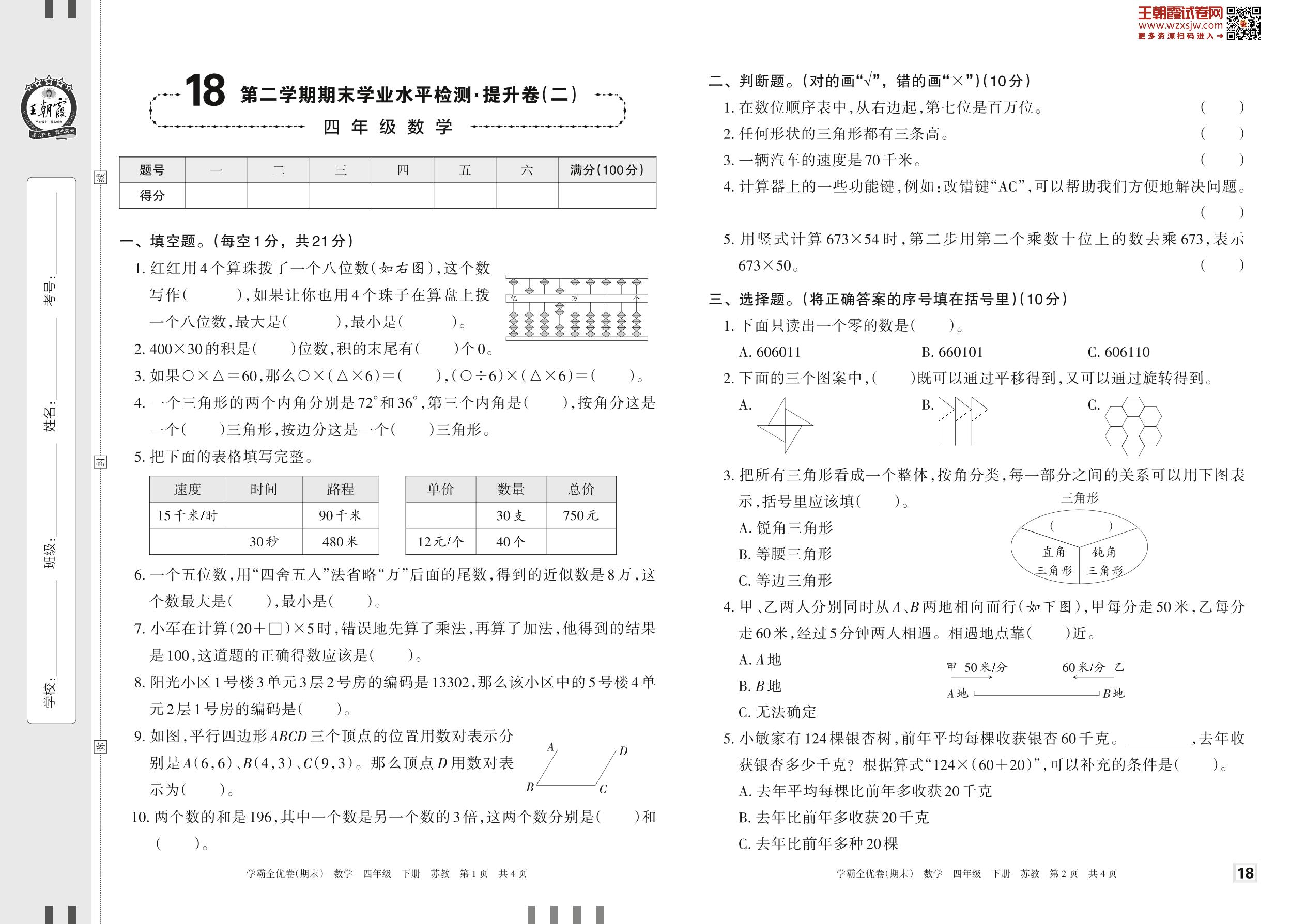 2023下册四年级数学苏教版 18 第二学期期末学业水平检测·提升卷(二)