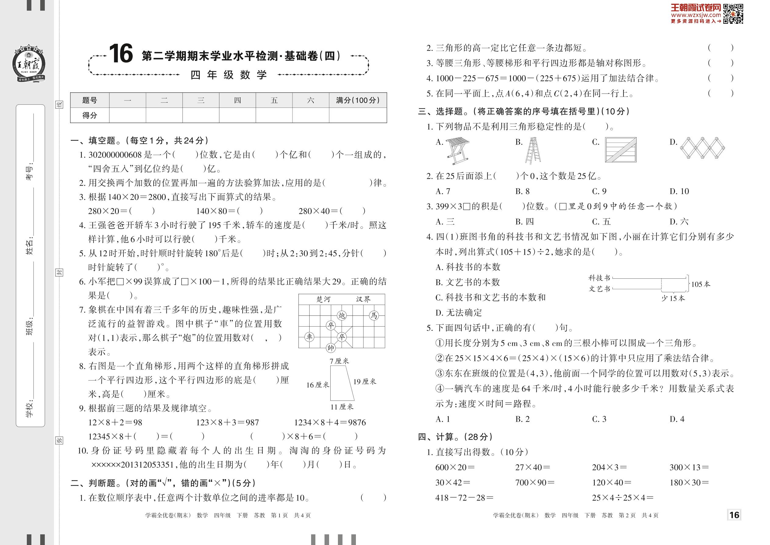 2023下册四年级数学苏教版 16 第二学期期末学业水平检测·基础卷(四)