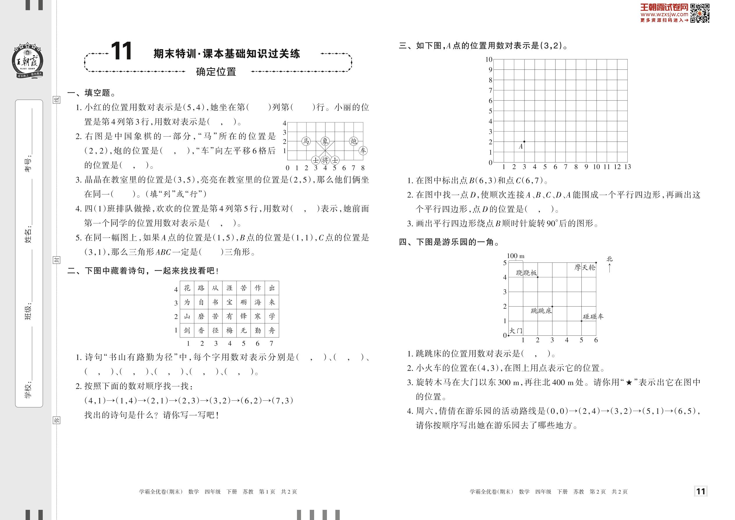 2023下册四年级数学苏教版 11 期末特训·课本基础知识过关练——确定位置