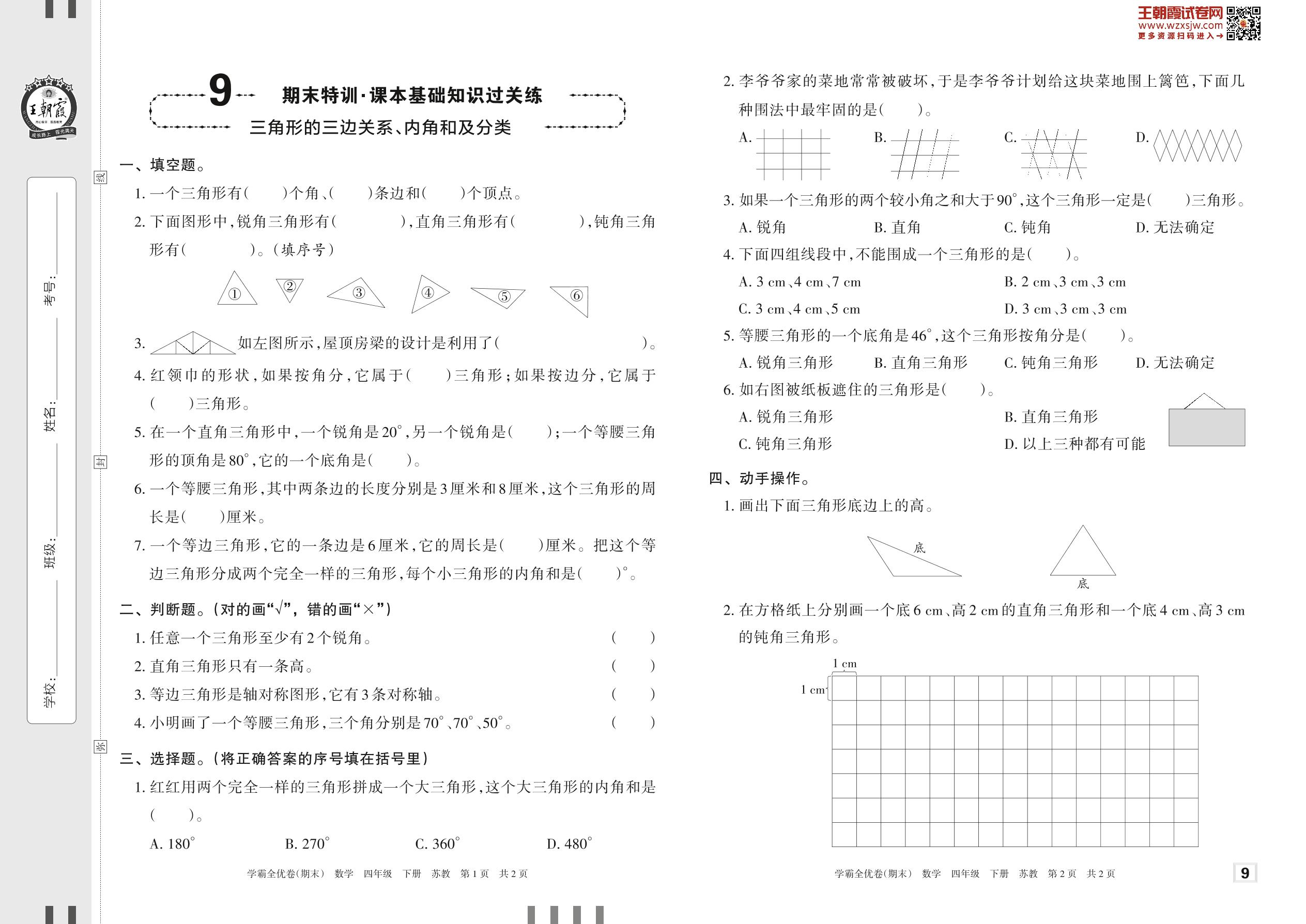 2023下册四年级数学苏教版 9 期末特训·课本基础知识过关练——三角形的三边关系、内角和及分类
