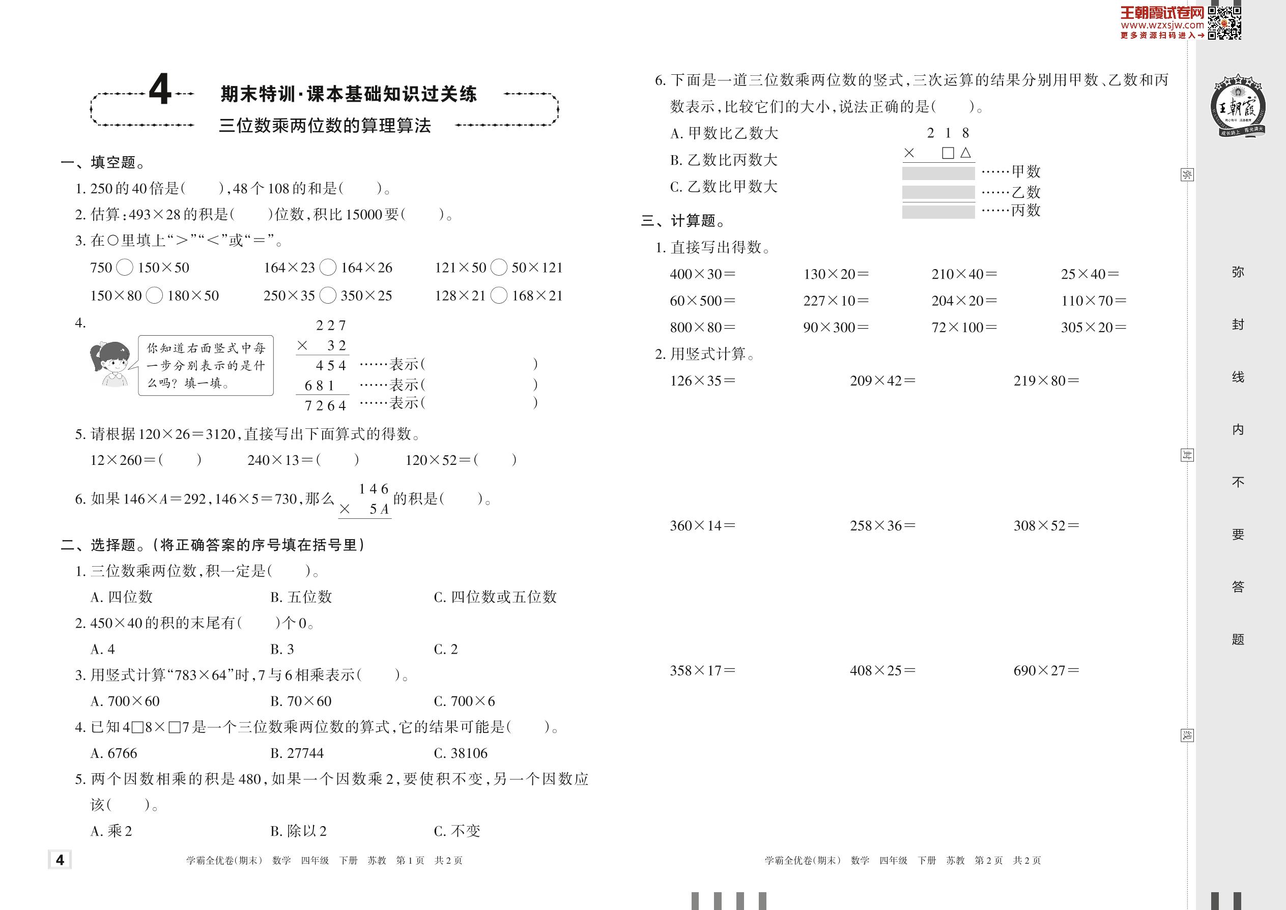 2023下册四年级数学苏教版 4 期末特训·课本基础知识过关练——三位数乘两位数的算理算法