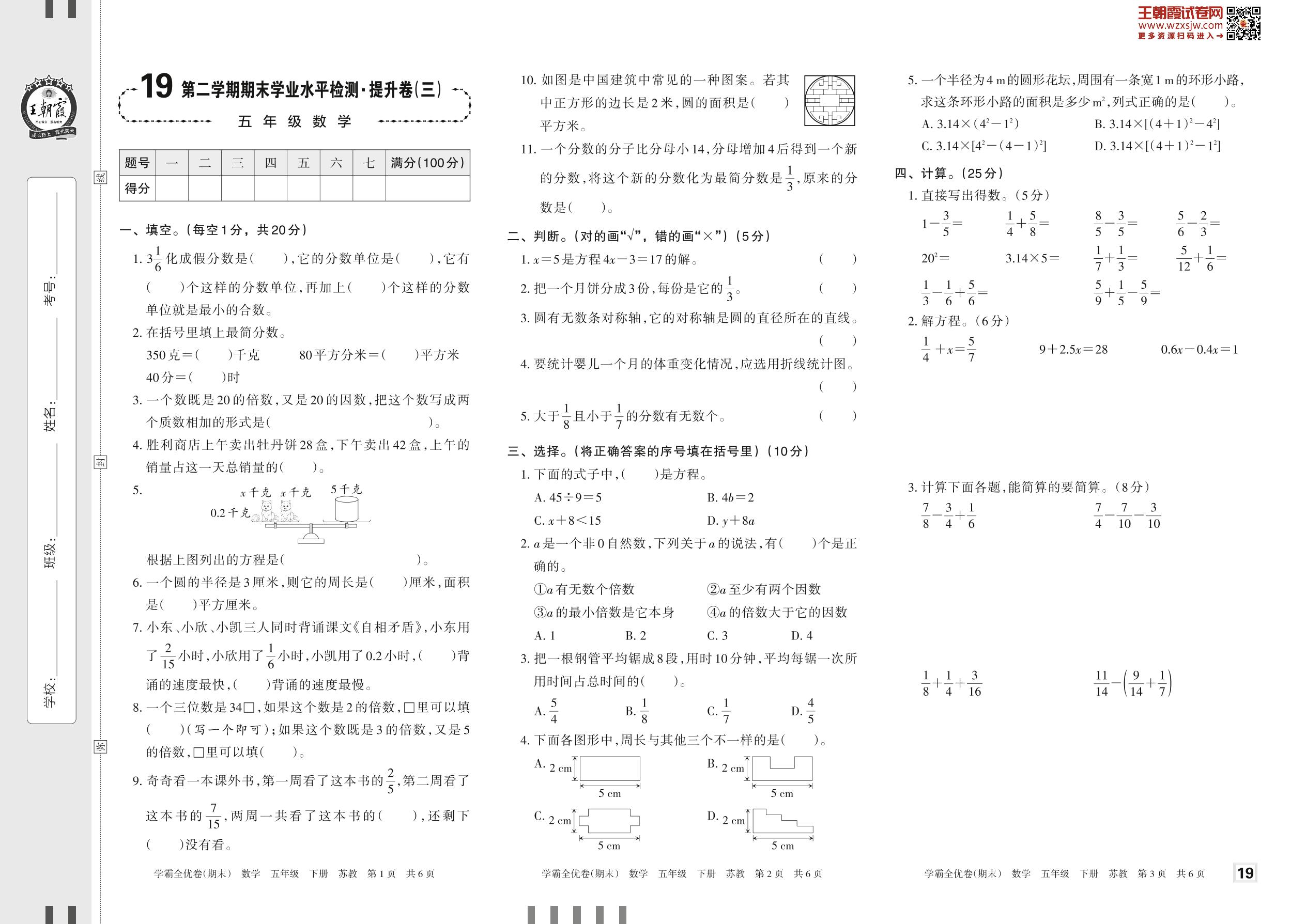 2023下册五年级数学苏教版 19 第二学期期末学业水平检测·提升卷(三)