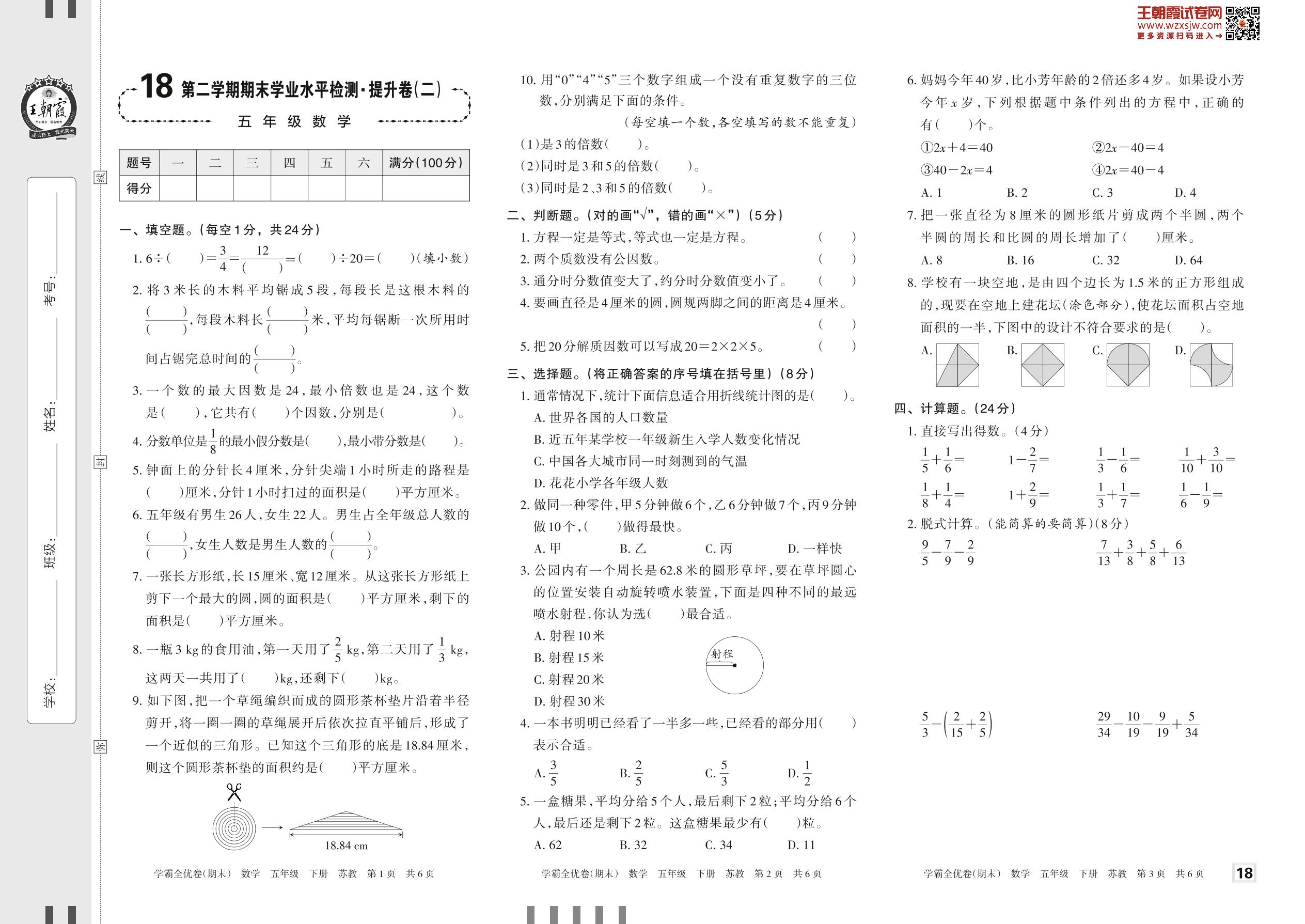 2023下册五年级数学苏教版 18 第二学期期末学业水平检测·提升卷(二)