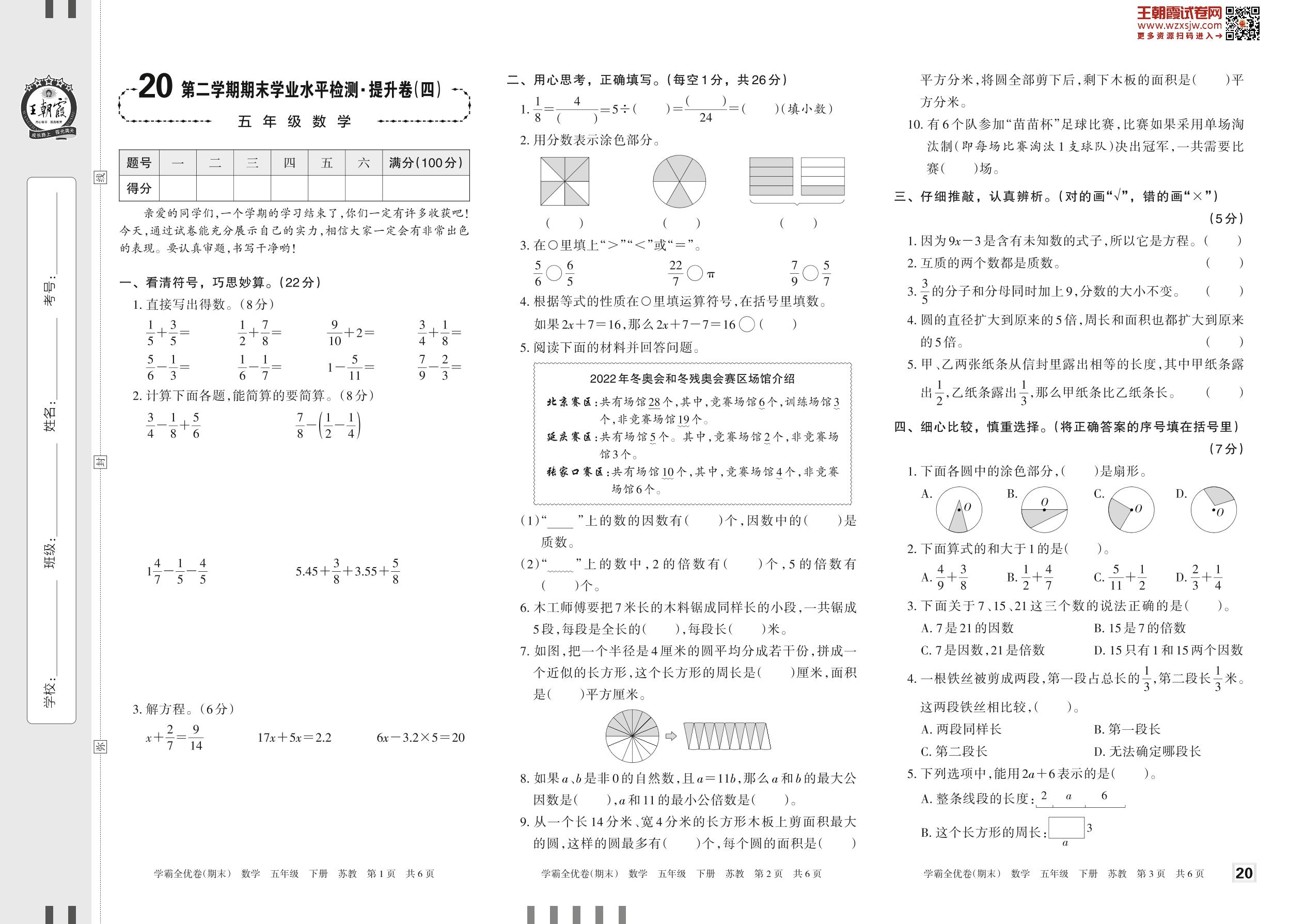 2023下册五年级数学苏教版 20 第二学期期末学业水平检测·提升卷(四)