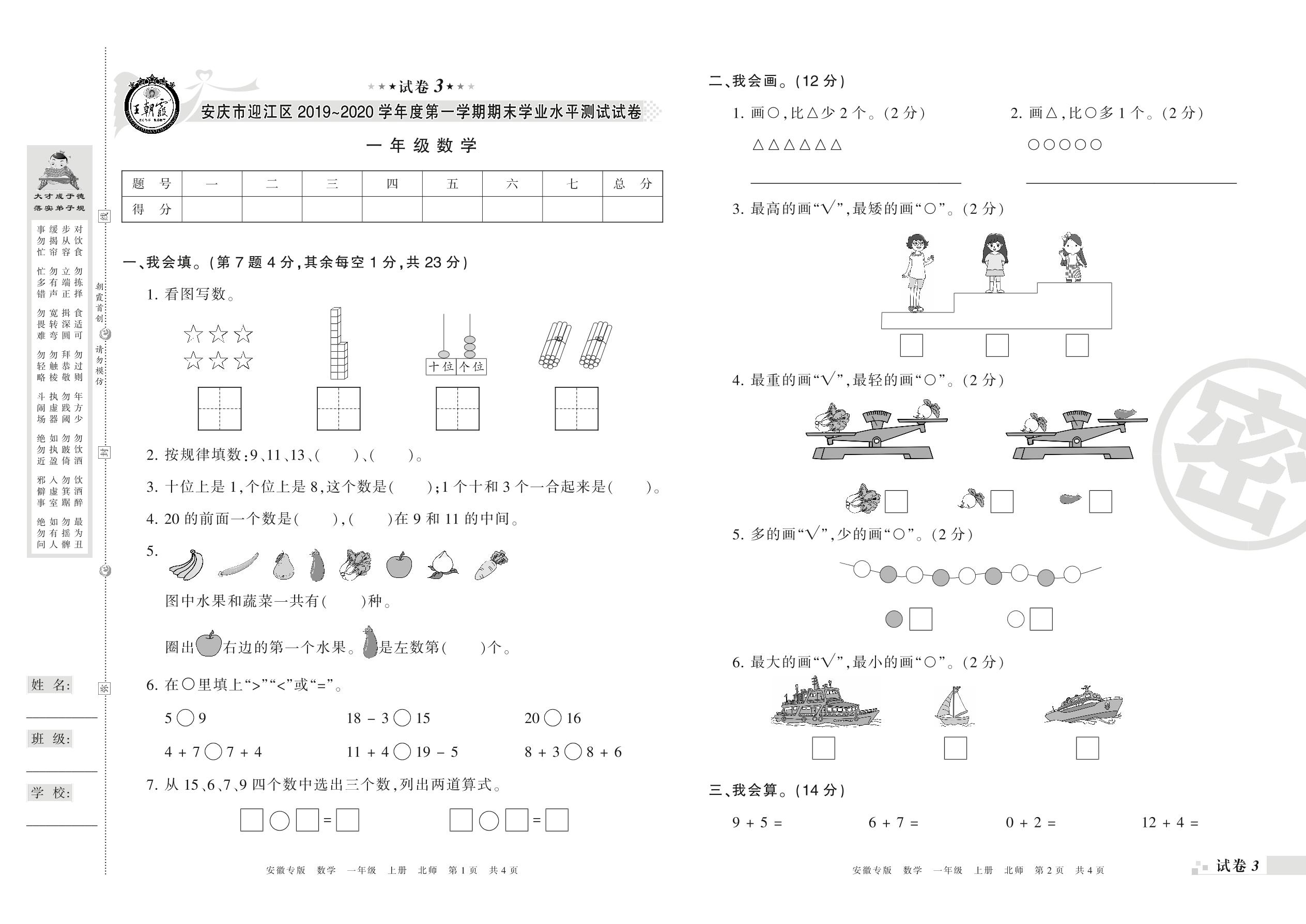 2019-2020学年第一学期安庆市迎江区一年级数学试卷(北师版)【3】