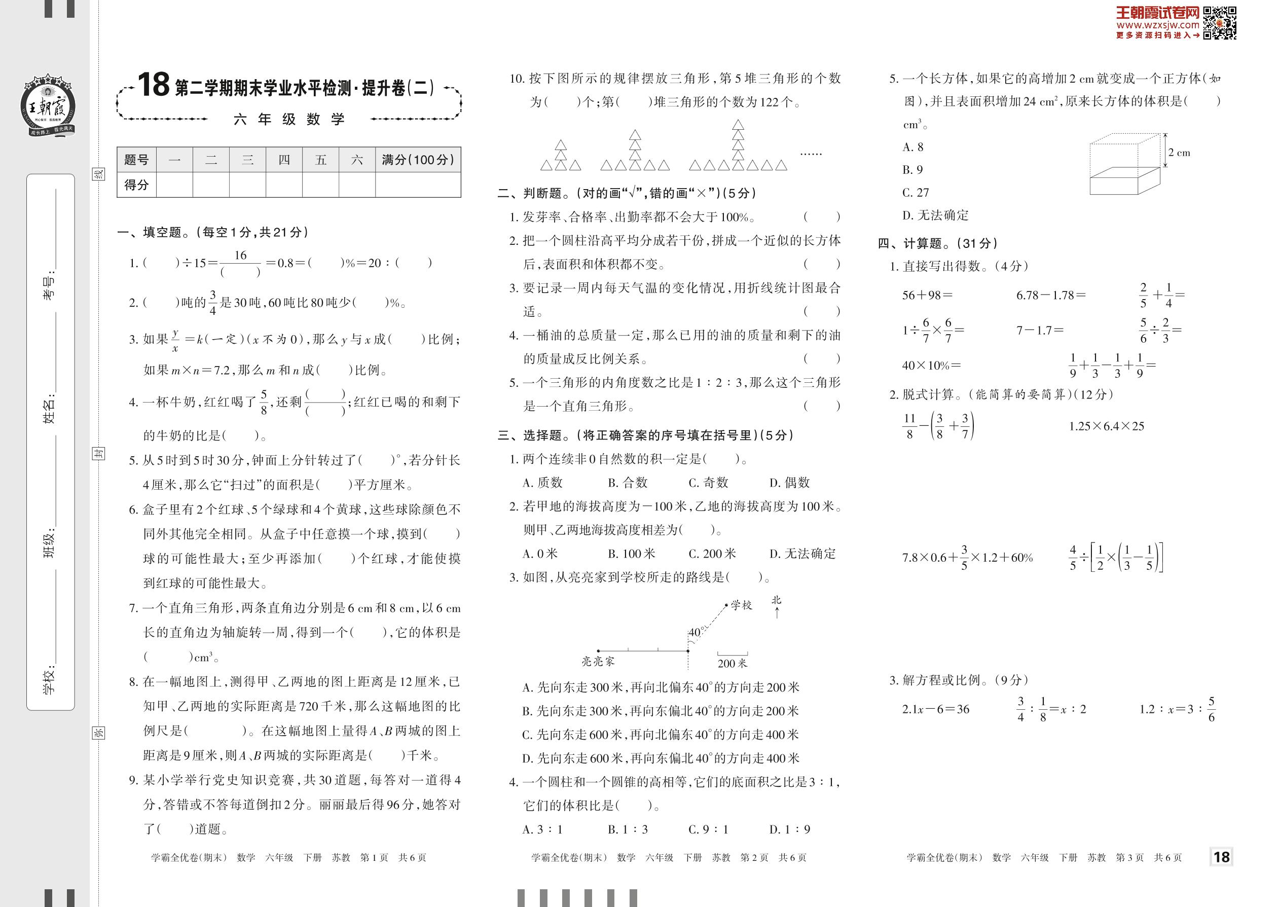2023下册六年级数学苏教版 18 第二学期期末学业水平检测·提升卷(二)
