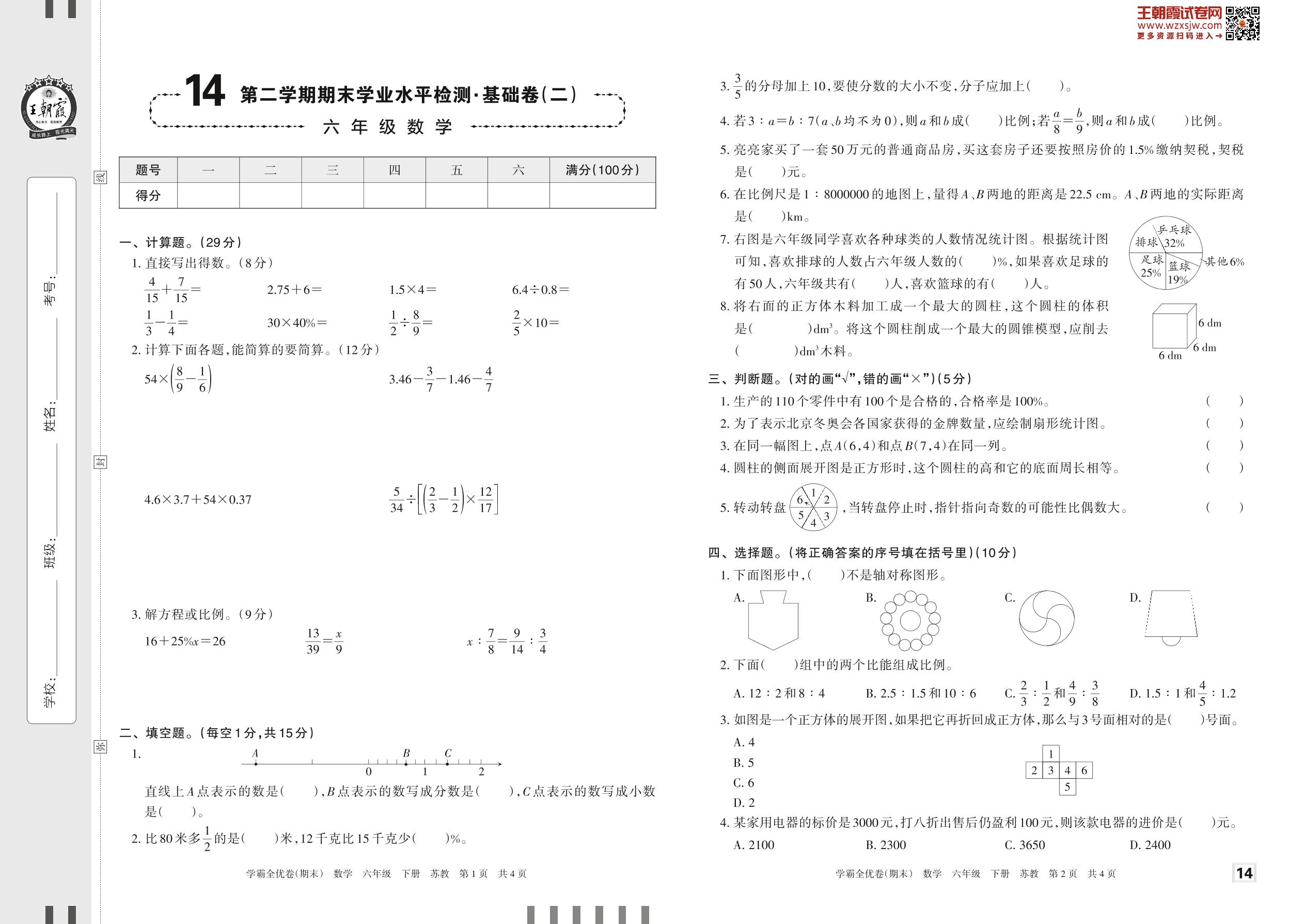 2023下册六年级数学苏教版 14 第二学期期末学业水平检测·基础卷(二)