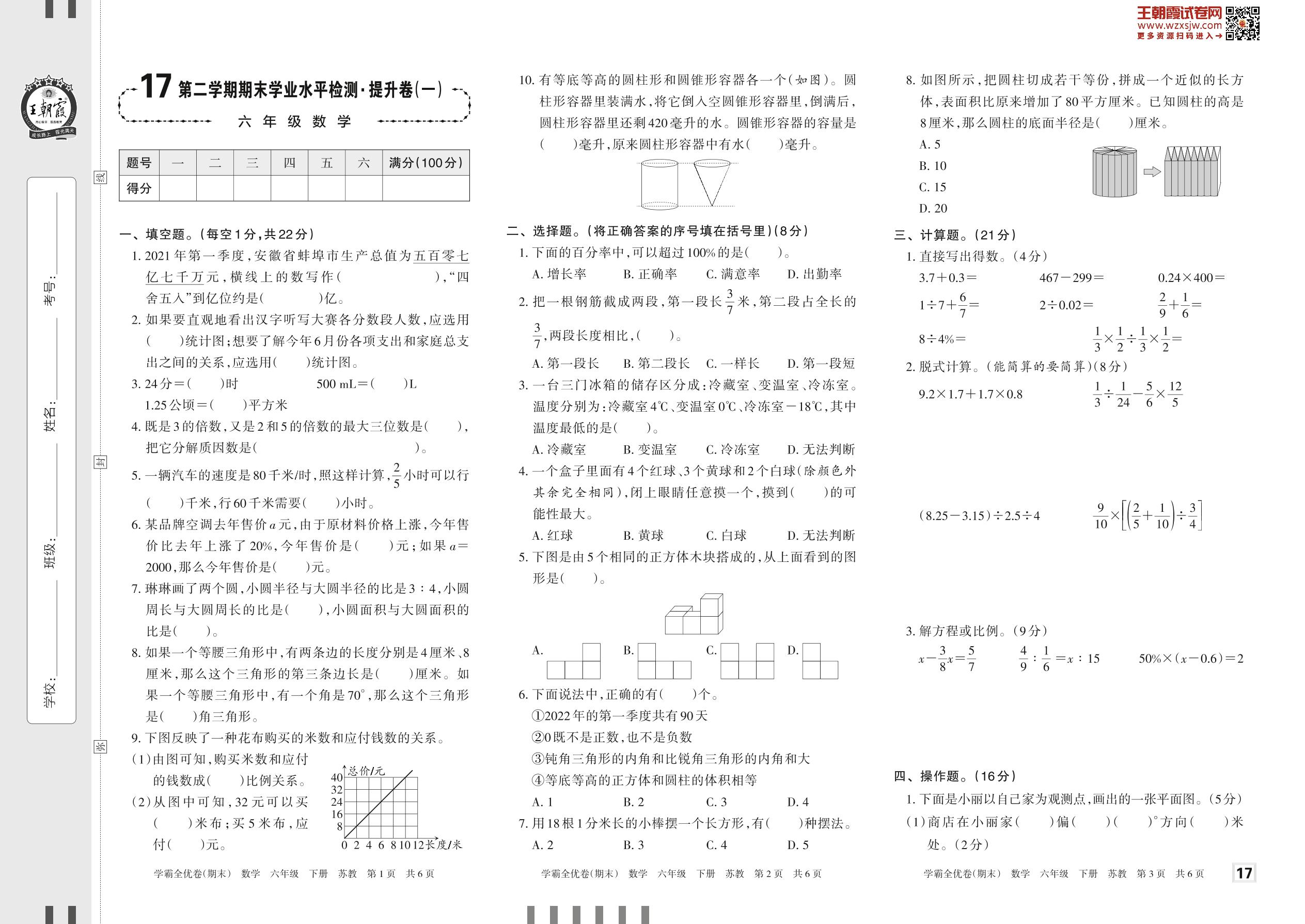 2023下册六年级数学苏教版 17 第二学期期末学业水平检测·提升卷(一)