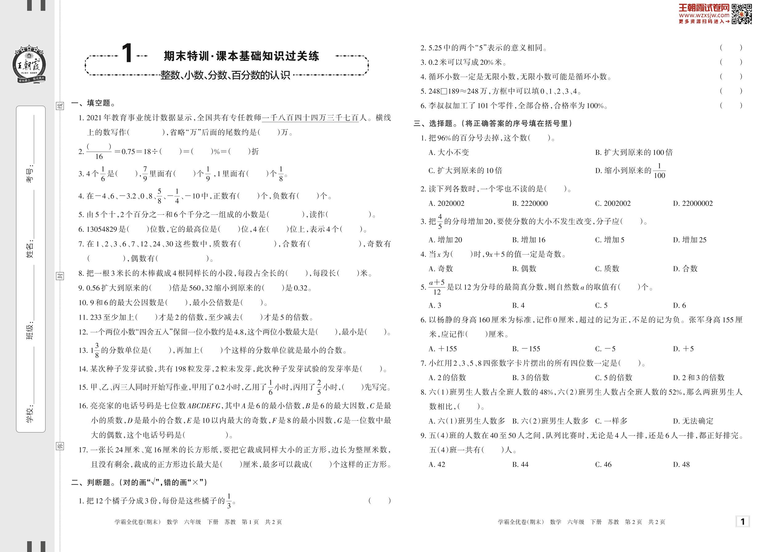 2023下册六年级数学苏教版 1 期末特训·课本基础知识过关练——整数、小数、分数、百分数的认识