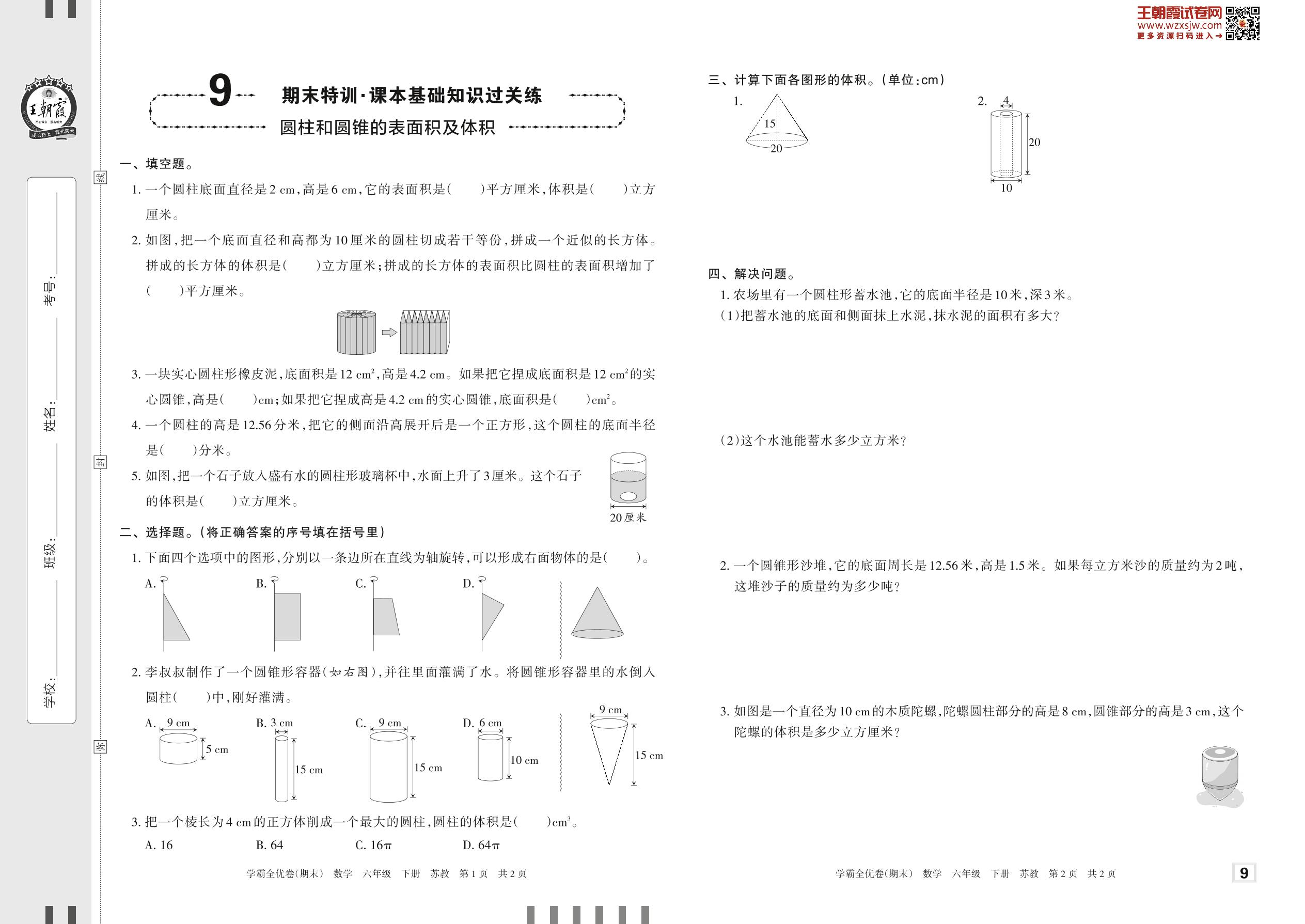 2023下册六年级数学苏教版 9 期末特训·课本基础知识过关练——圆柱和圆锥的表面积及体积