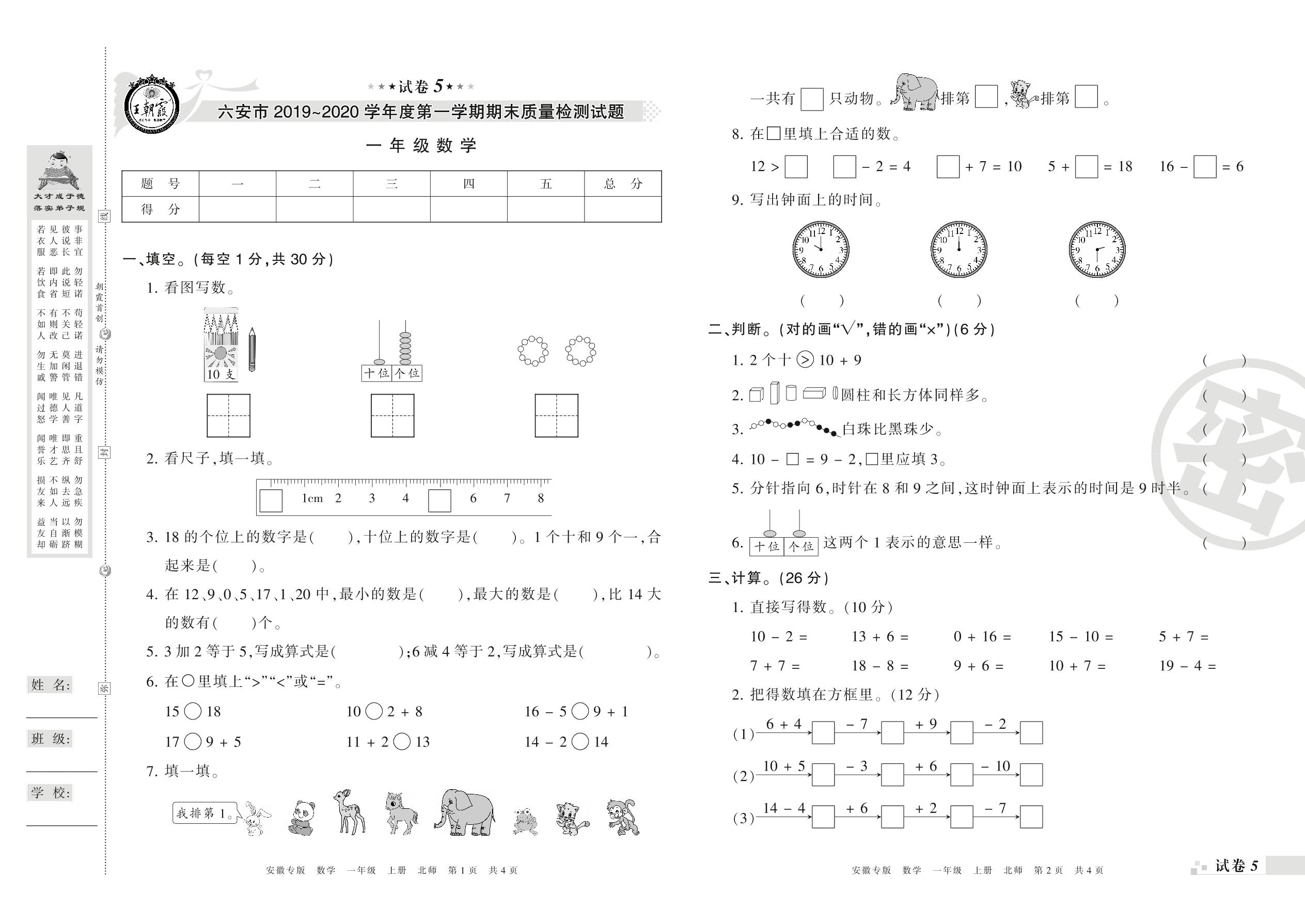 2019-2020学年第一学期六安市一年级数学试卷(北师版)【5】