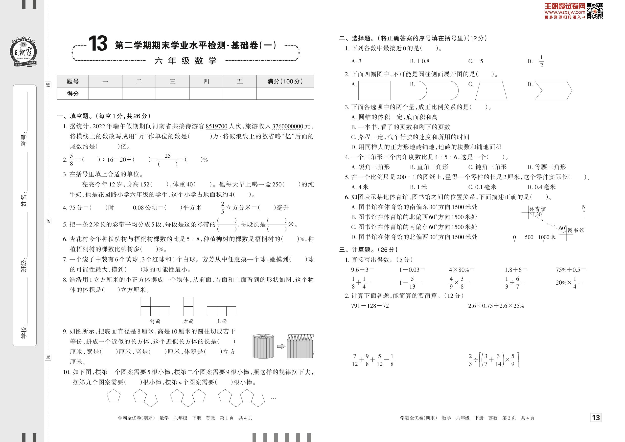 2023下册六年级数学苏教版 13 第二学期期末学业水平检测·基础卷(一)
