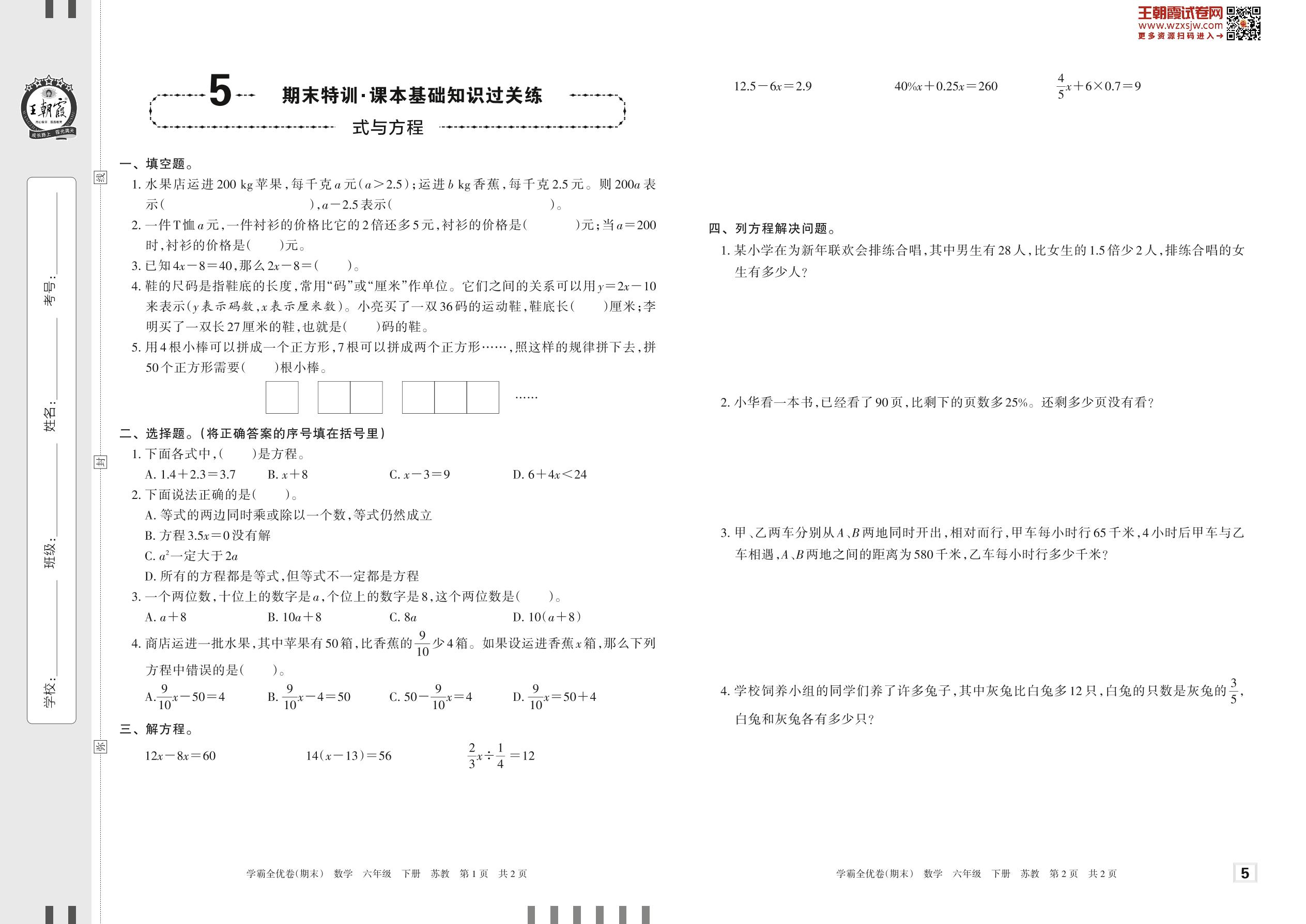 2023下册六年级数学苏教版 5 期末特训·课本基础知识过关练——式与方程