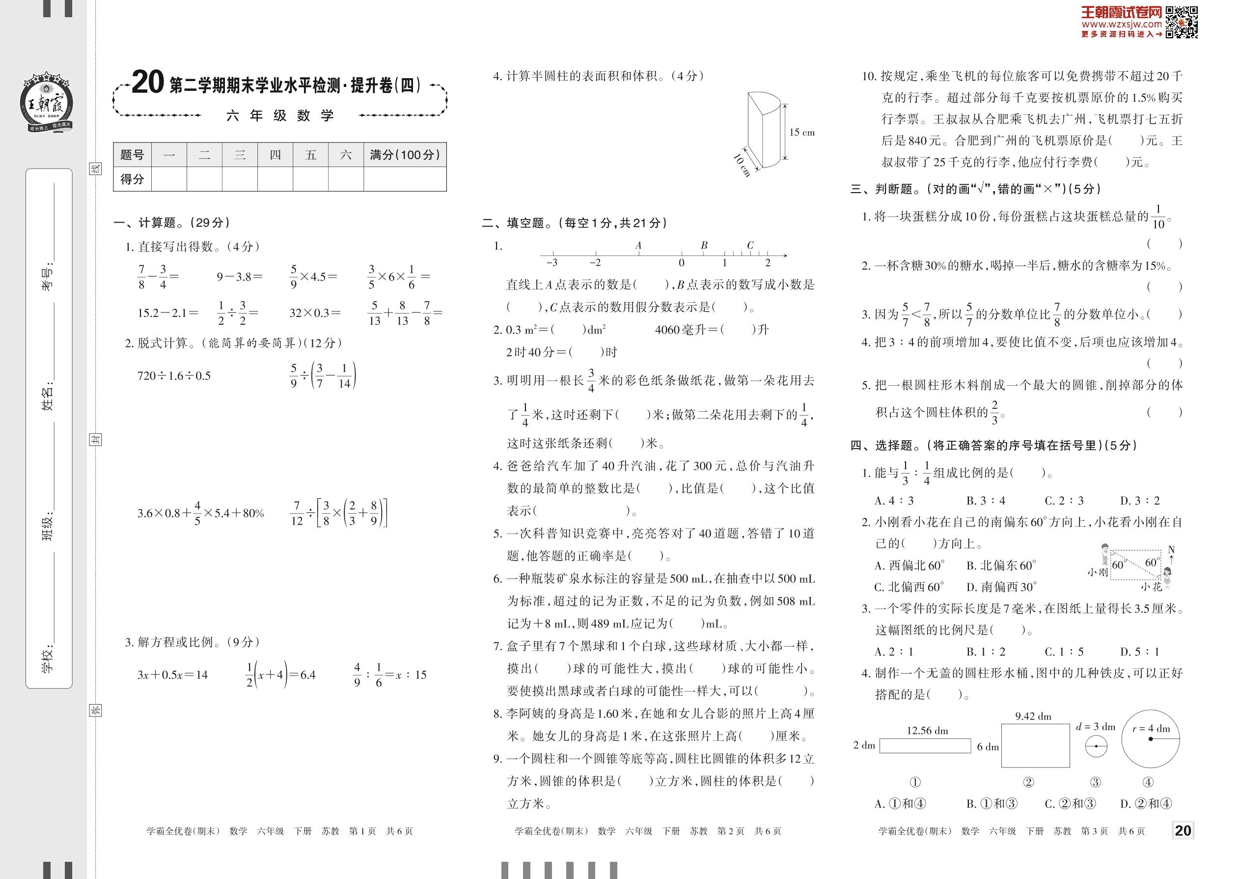 2023下册六年级数学苏教版 20 第二学期期末学业水平检测·提升卷(四)
