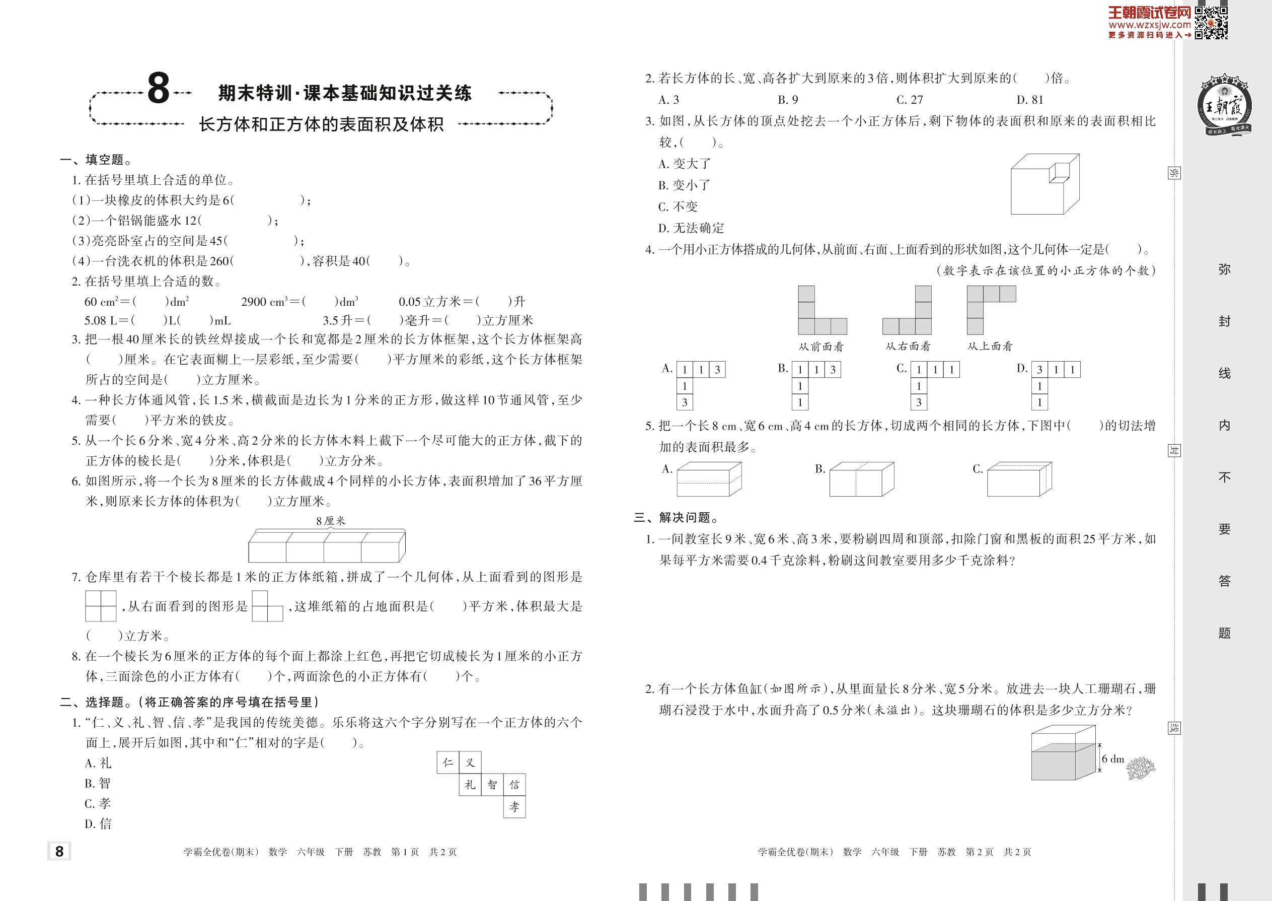 2023下册六年级数学苏教版 8 期末特训·课本基础知识过关练——长方体和正方体的表面积及体积