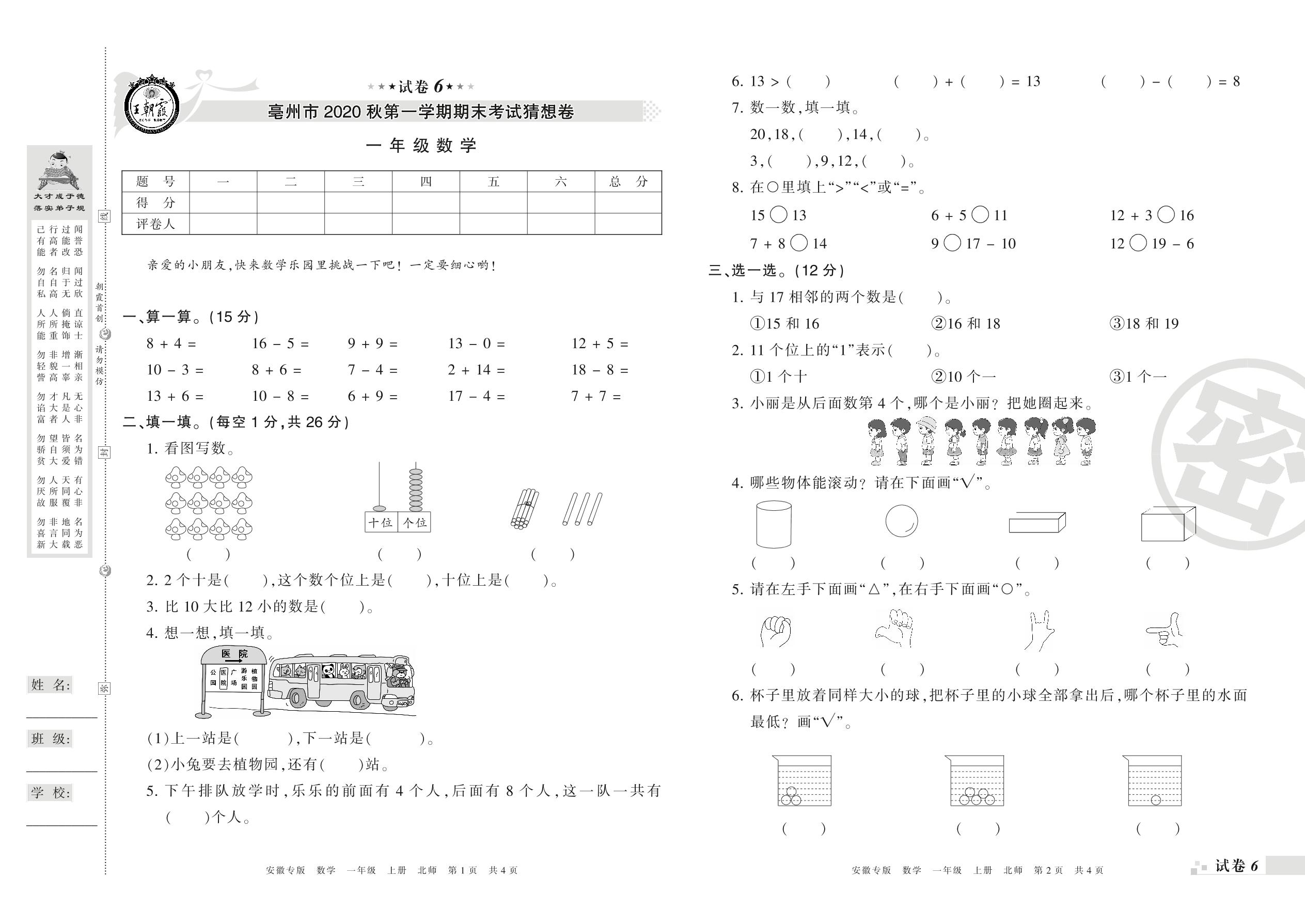 2019-2020学年第一学期亳州市一年级数学试卷(北师版)【6】