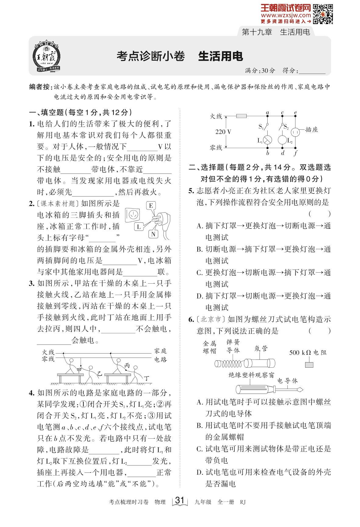 2023-2024学年九年级物理人教版 第十九章 考点诊断小卷 生活用电