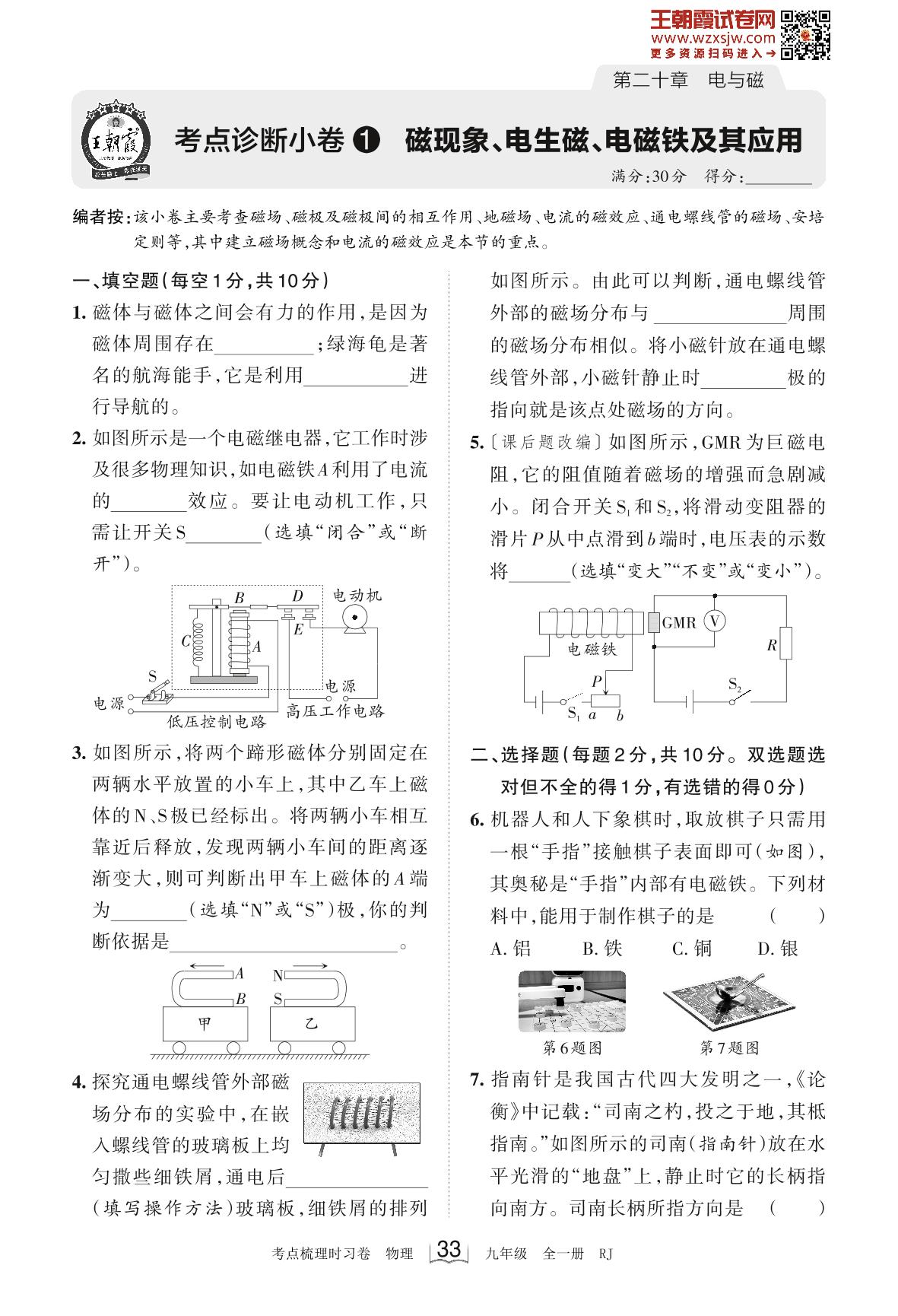 2023-2024学年九年级物理人教版 第二十章 考点诊断小卷1 磁现象、电生磁、电磁铁及其应用