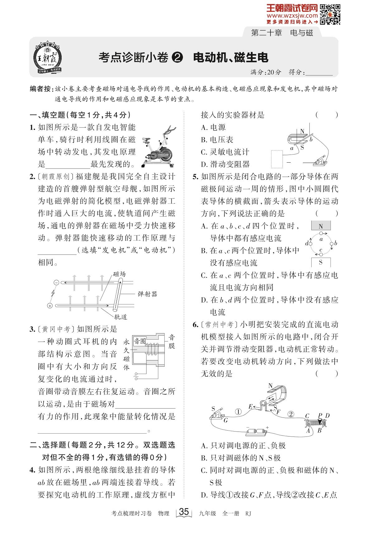 2023-2024学年九年级物理人教版 第二十章 考点诊断小卷2 电动机、磁生电