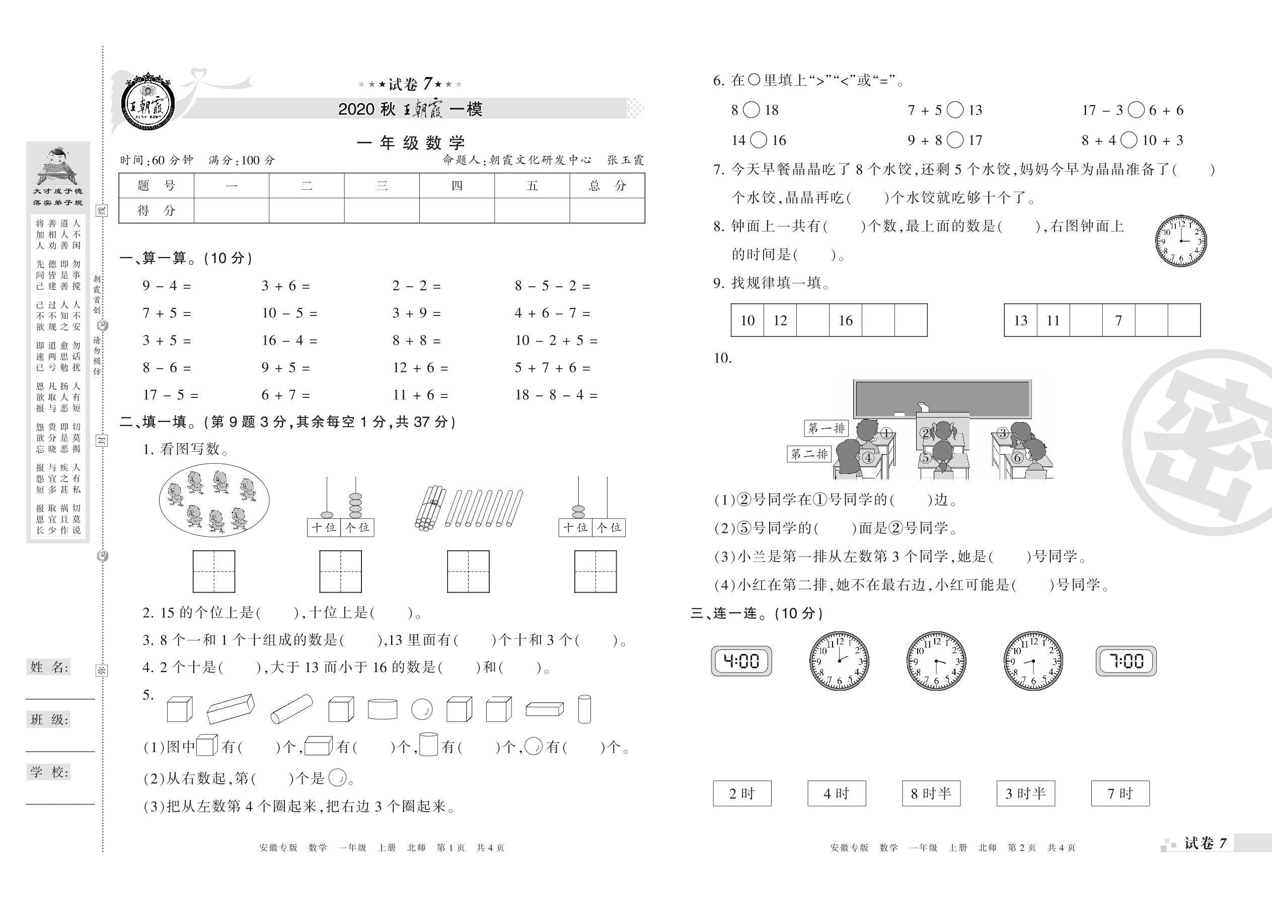 王朝霞期末模拟卷一年级上册数学(北师版)_R210802212517【7】
