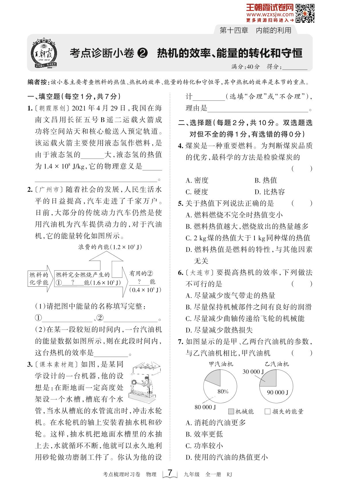 2023-2024学年九年级物理人教版 第十四章 考点诊断小卷2 热机的效率、能量的转化和守恒