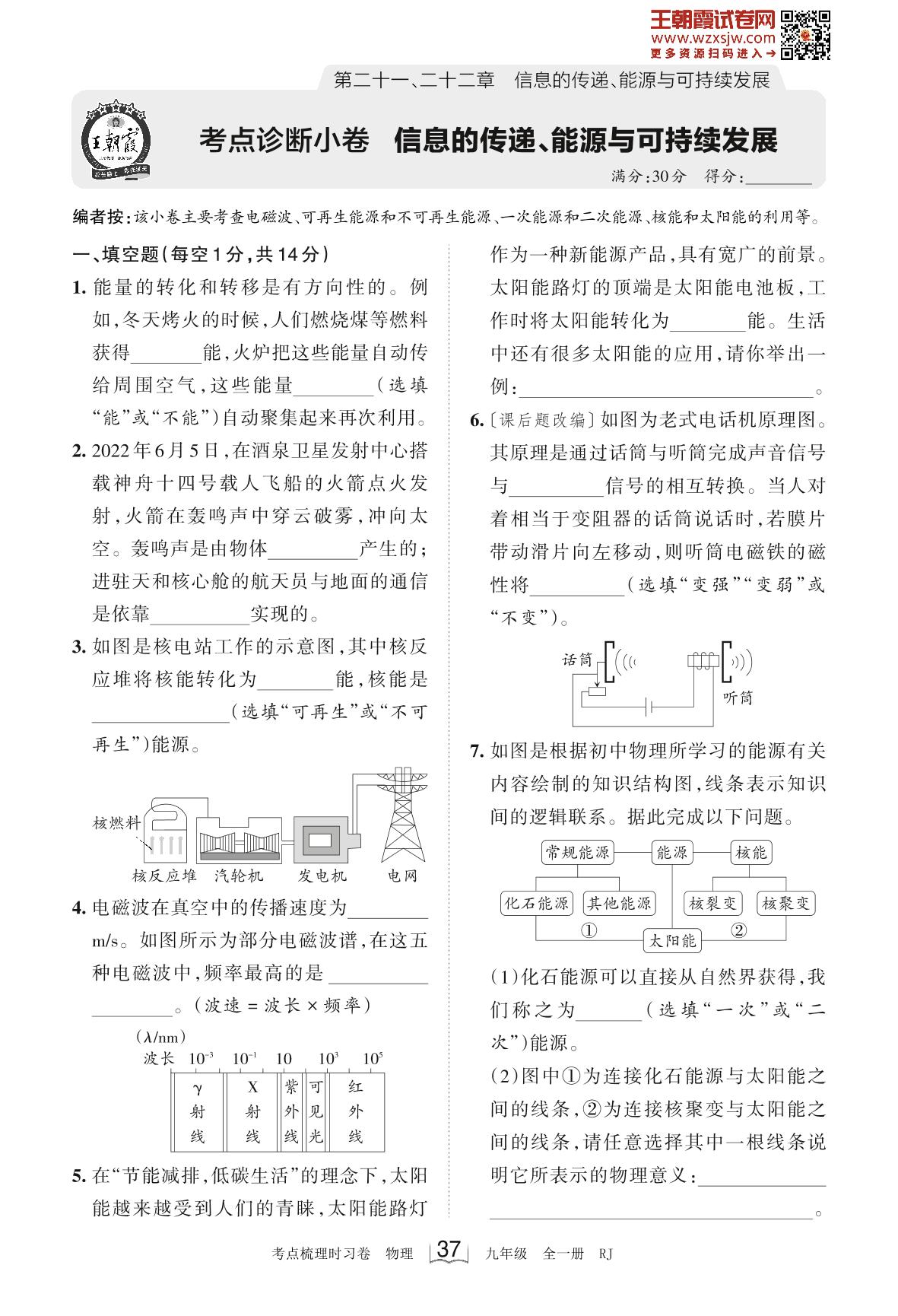 2023-2024学年九年级物理人教版 第二十一、二十二章 考点诊断小卷 信息的传递、能源与可持续发展
