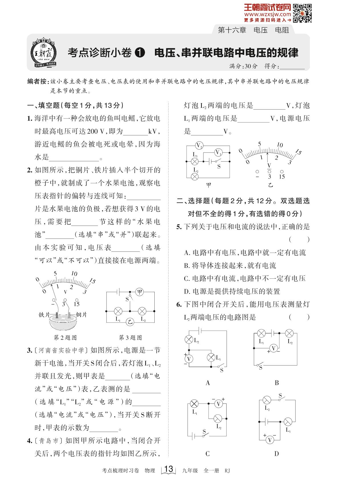 2023-2024学年九年级物理人教版 第十六章 考点诊断小卷1 电压、串并联电路中电压的规律
