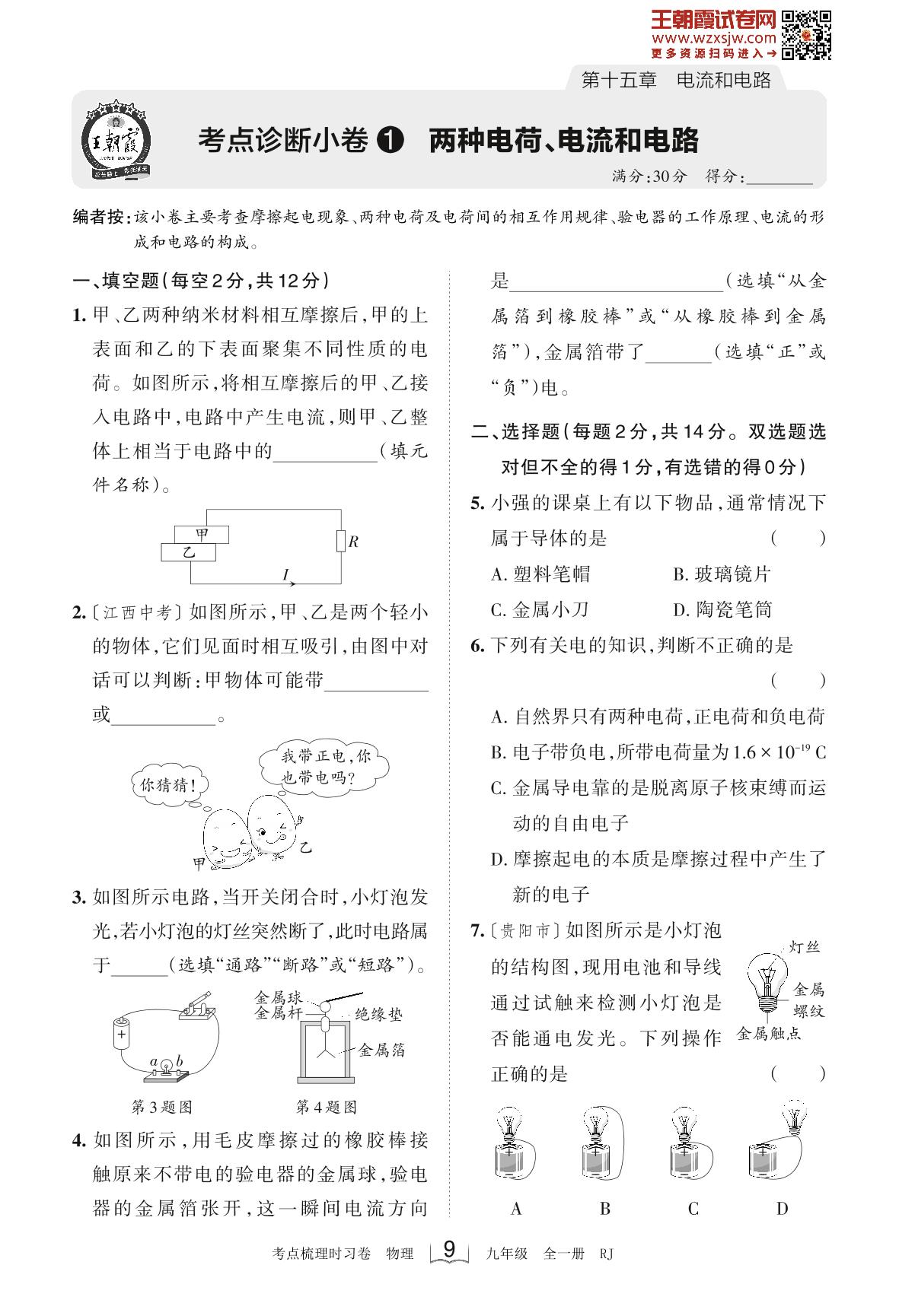 2023-2024学年九年级物理人教版 第十五章 考点诊断小卷1 两种电荷、电流和电路