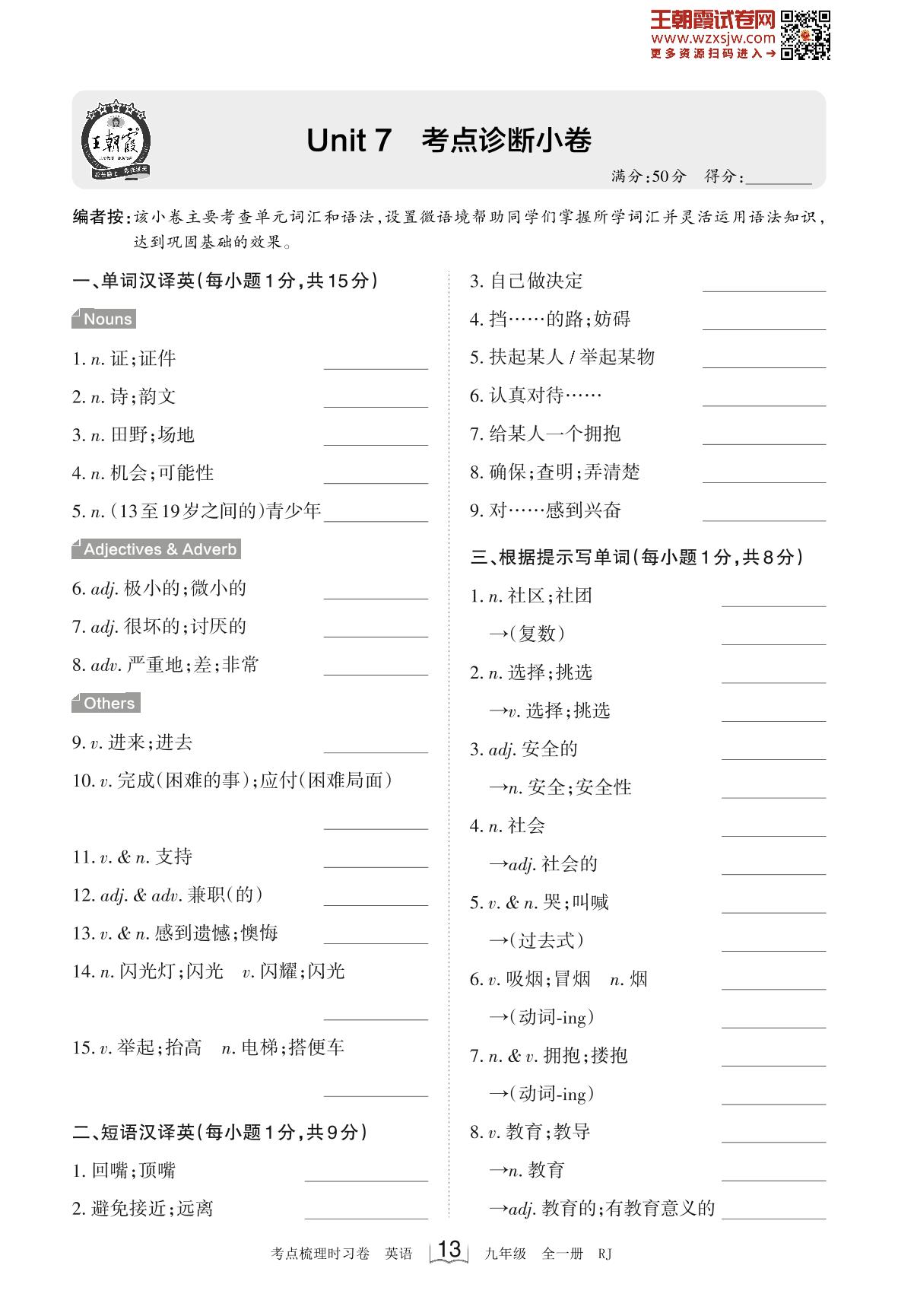 2023-2024学年九年级英语人教版 Unit 7 考点诊断小卷