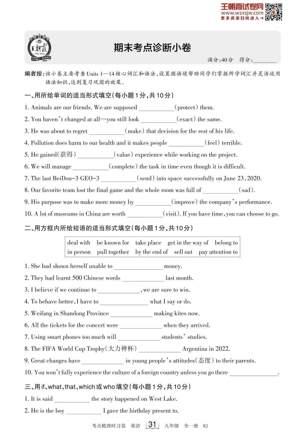 2023-2024学年九年级英语人教版 期末考点诊断小卷
