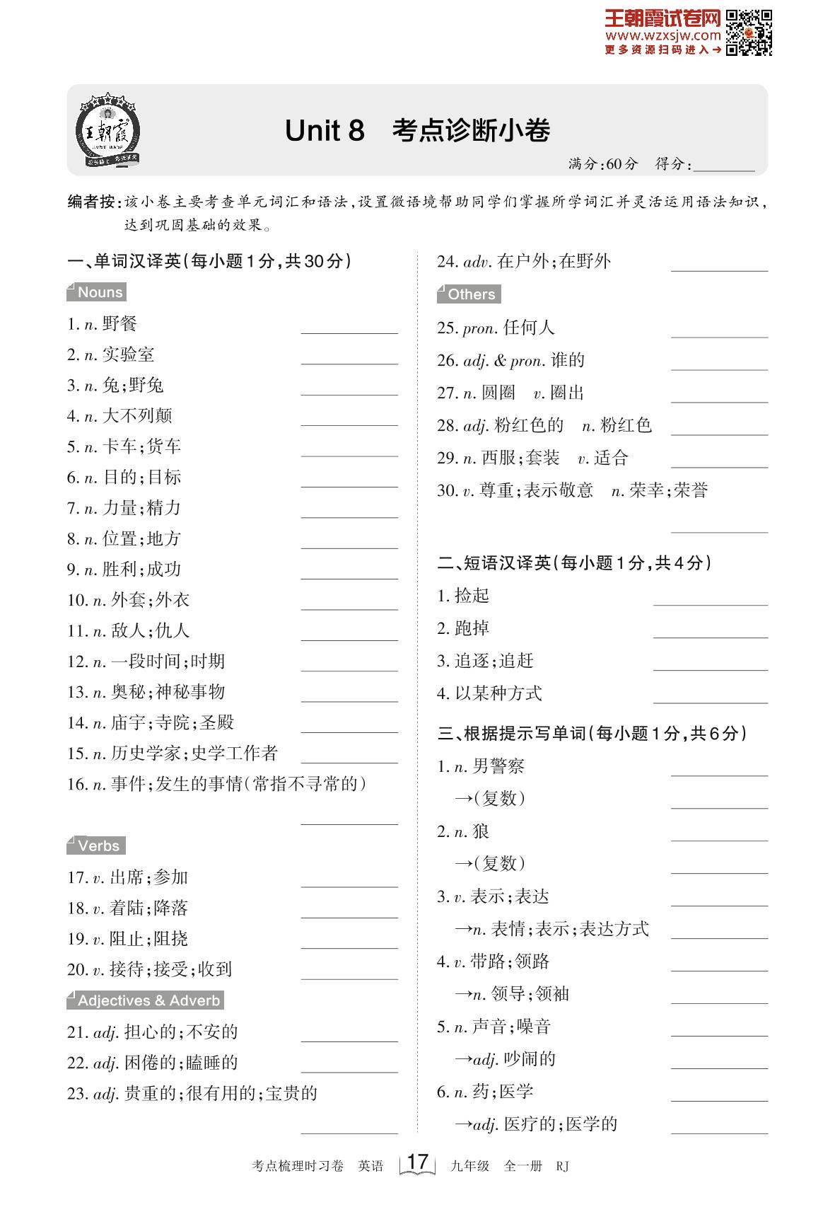 2023-2024学年九年级英语人教版 Unit 8 考点诊断小卷