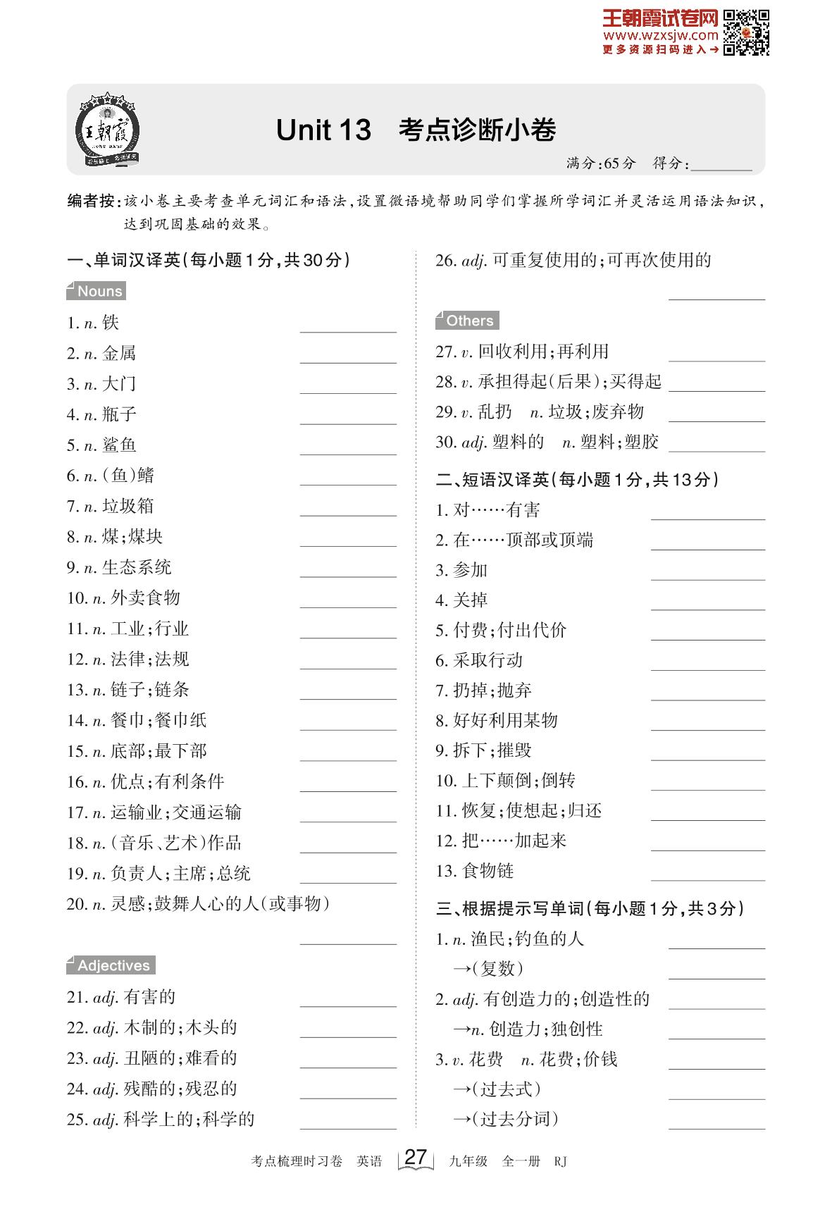 2023-2024学年九年级英语人教版 Unit 13 考点诊断小卷