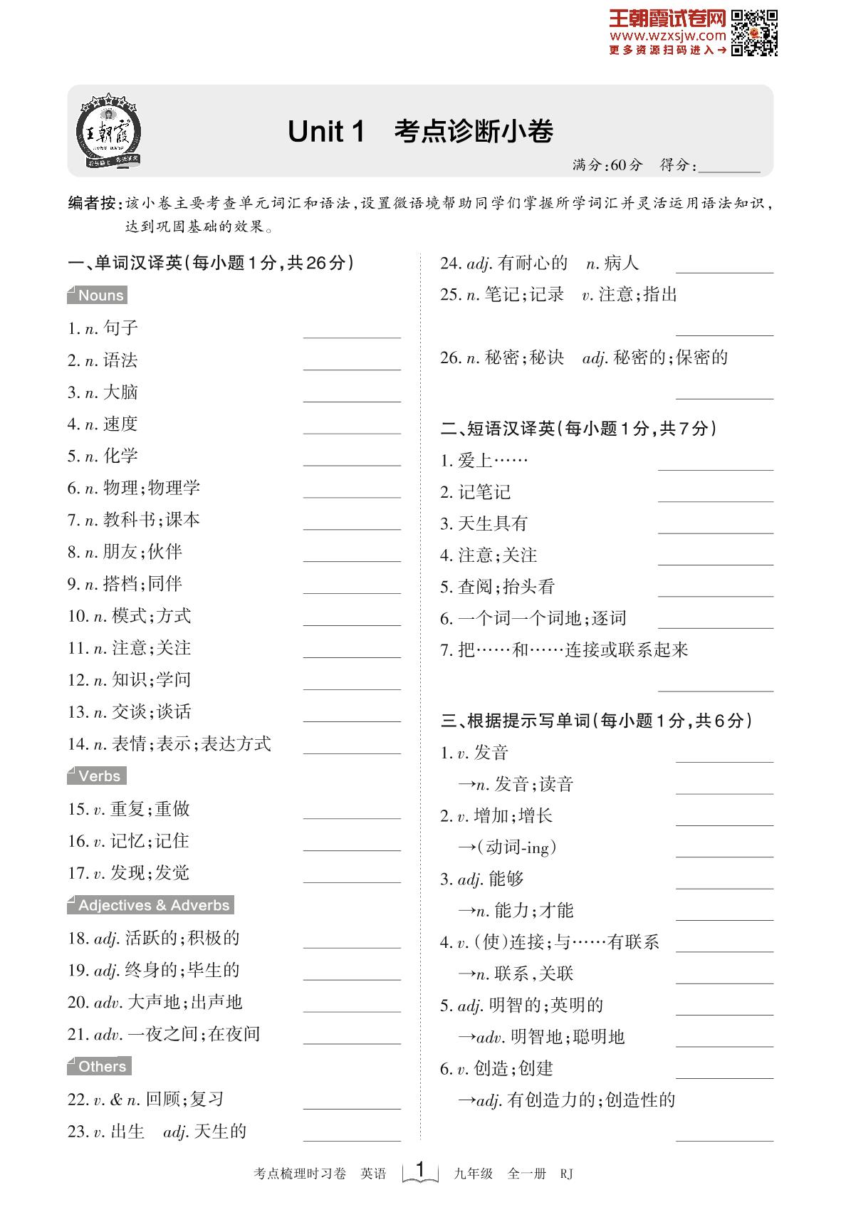 2023-2024学年九年级英语人教版 Unit 1 考点诊断小卷